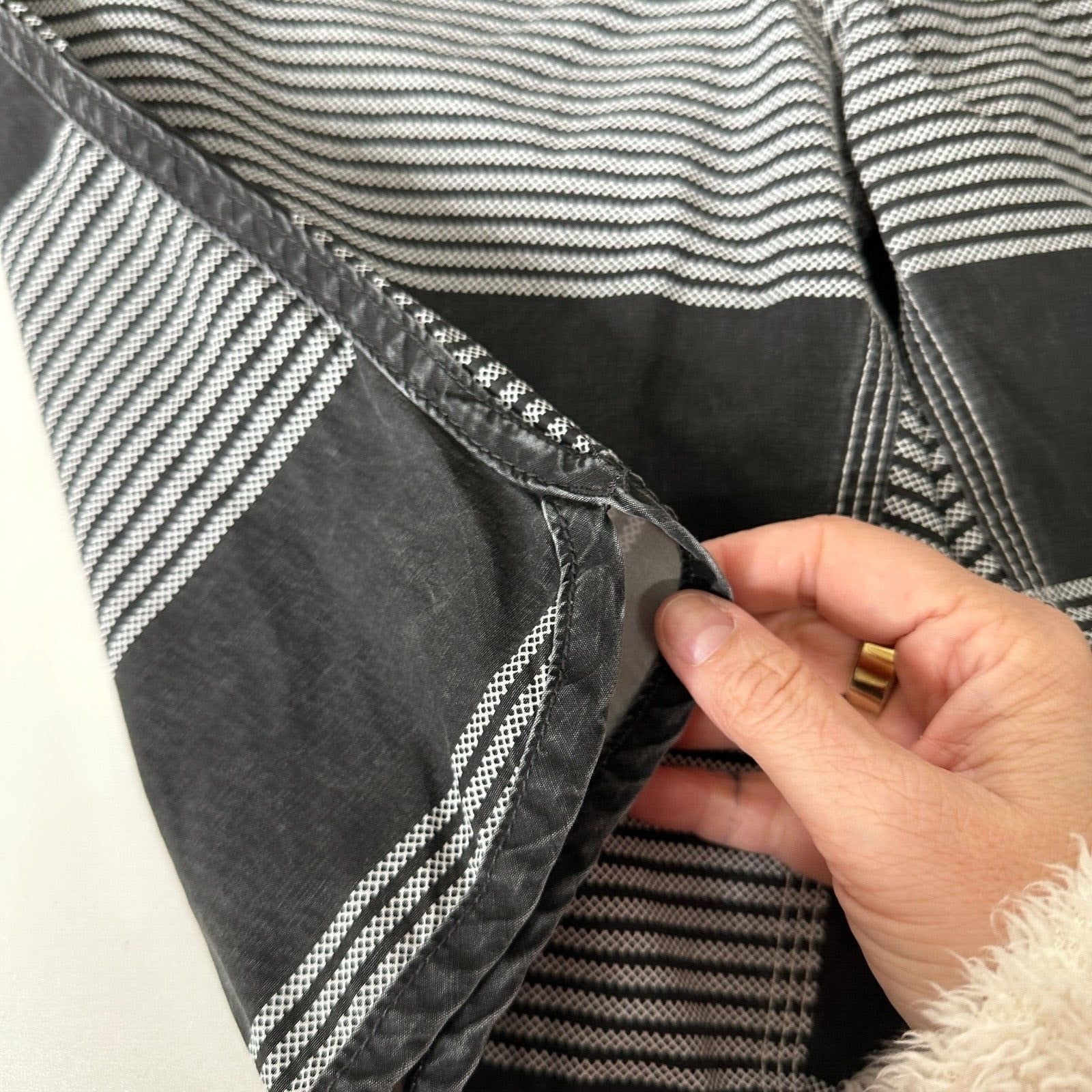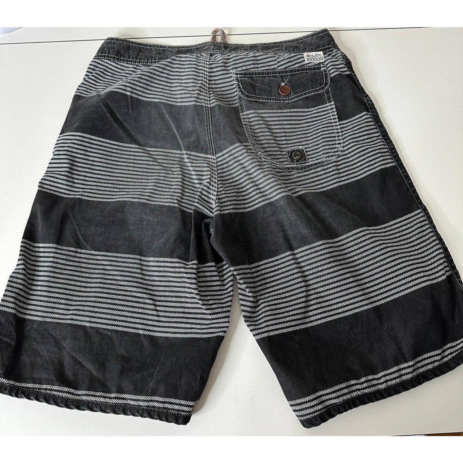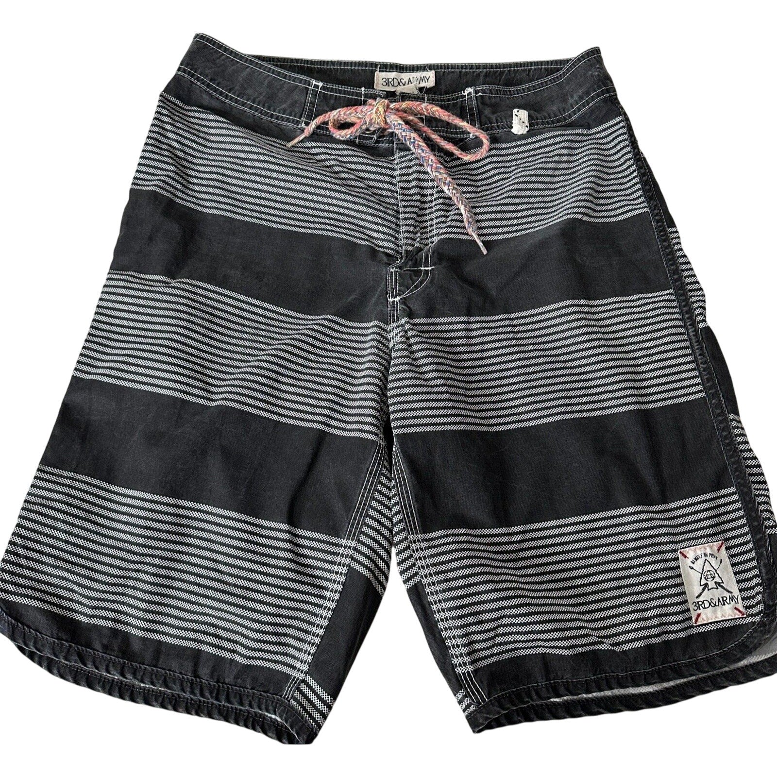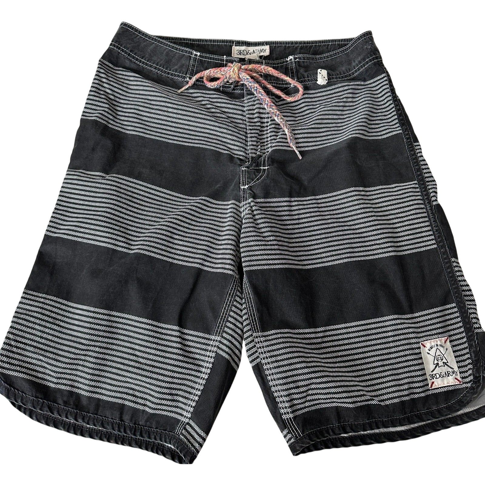 Introducing the 3rd & Army Mens Black & White Striped Tie Waist Back Pocket Board Shorts in Size 30. These stylish board shorts feature a unique black and white striped design that will make you stand out at the beach or pool. With a comfortable tie waist and a convenient back pocket, these shorts are both functional and fashionable. Upgrade your summer wardrobe with these trendy board shorts.