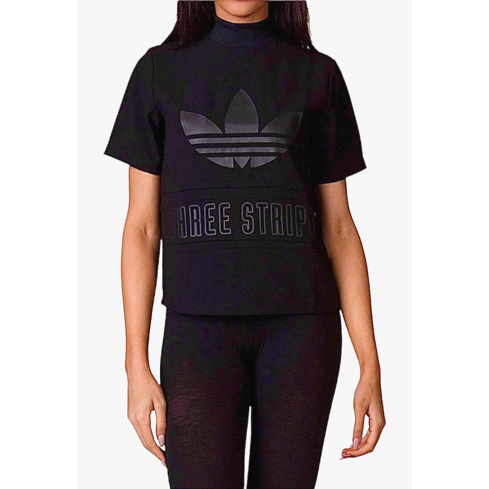 Adidas Black Trefoil Three Stripe Graphic Mock Neck Back Zip Short Sleeve Top S
