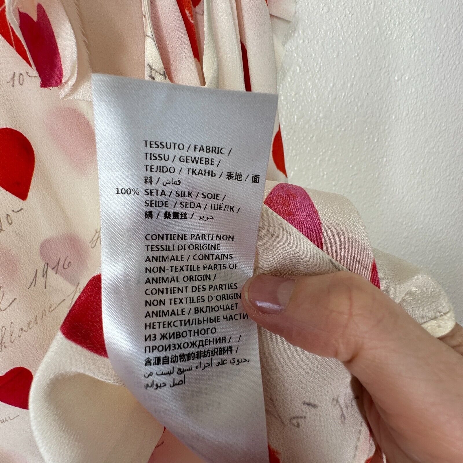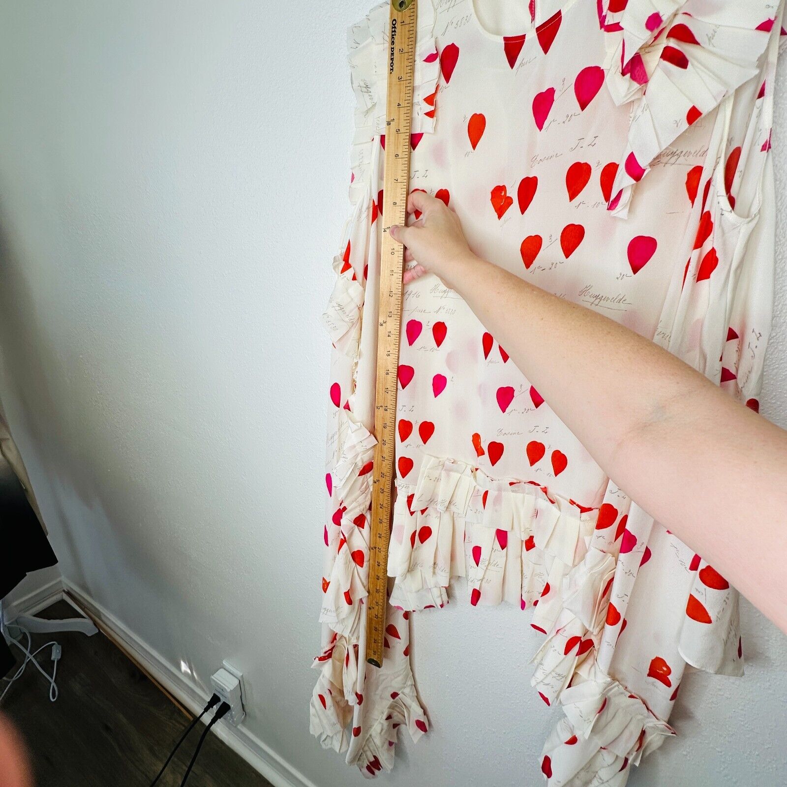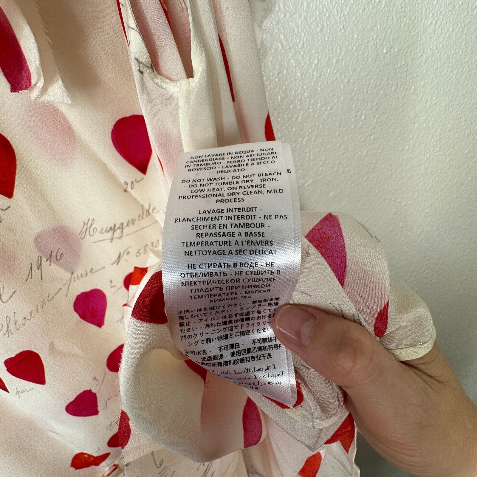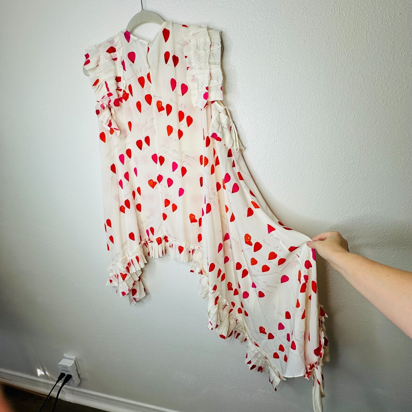 Created from soft silk crepe de chine, this tank top features petals and handwriting print, pleated patches at shoulder and at asymmetric bottom, row cut, rear two buttons key hole closure.