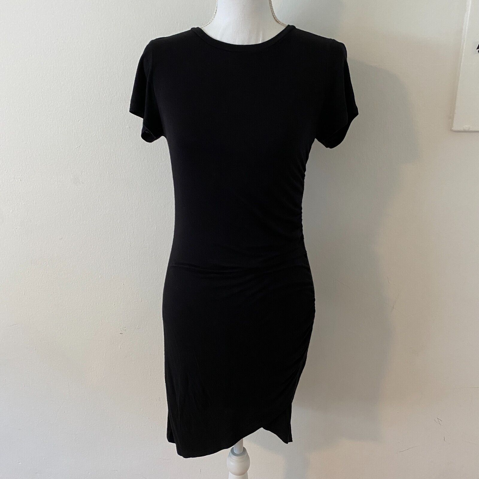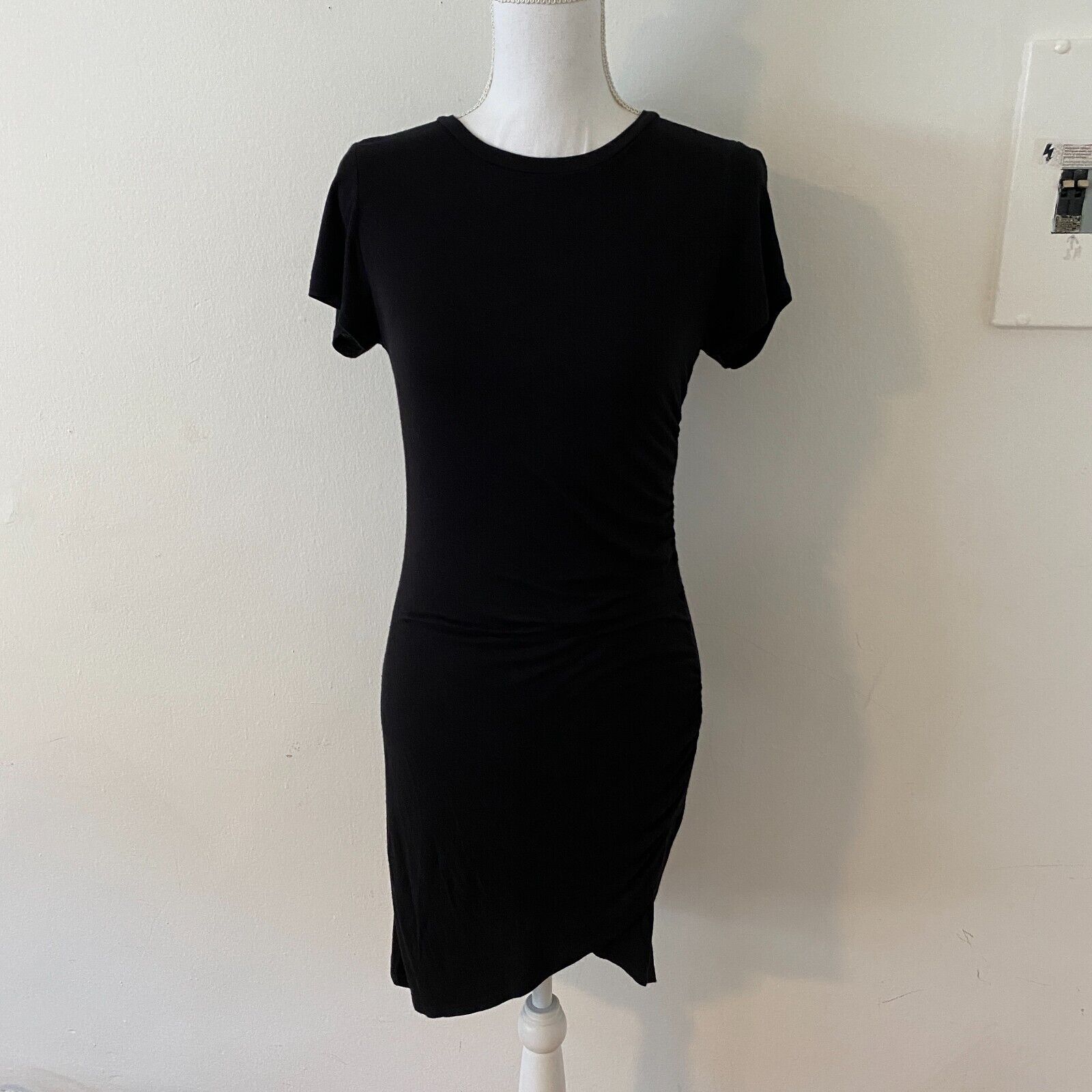 Alya Solid Black SUPER CUTE Bodycon Stretchy T Shirt Dress Asymmetrical Ruched Side LBD
