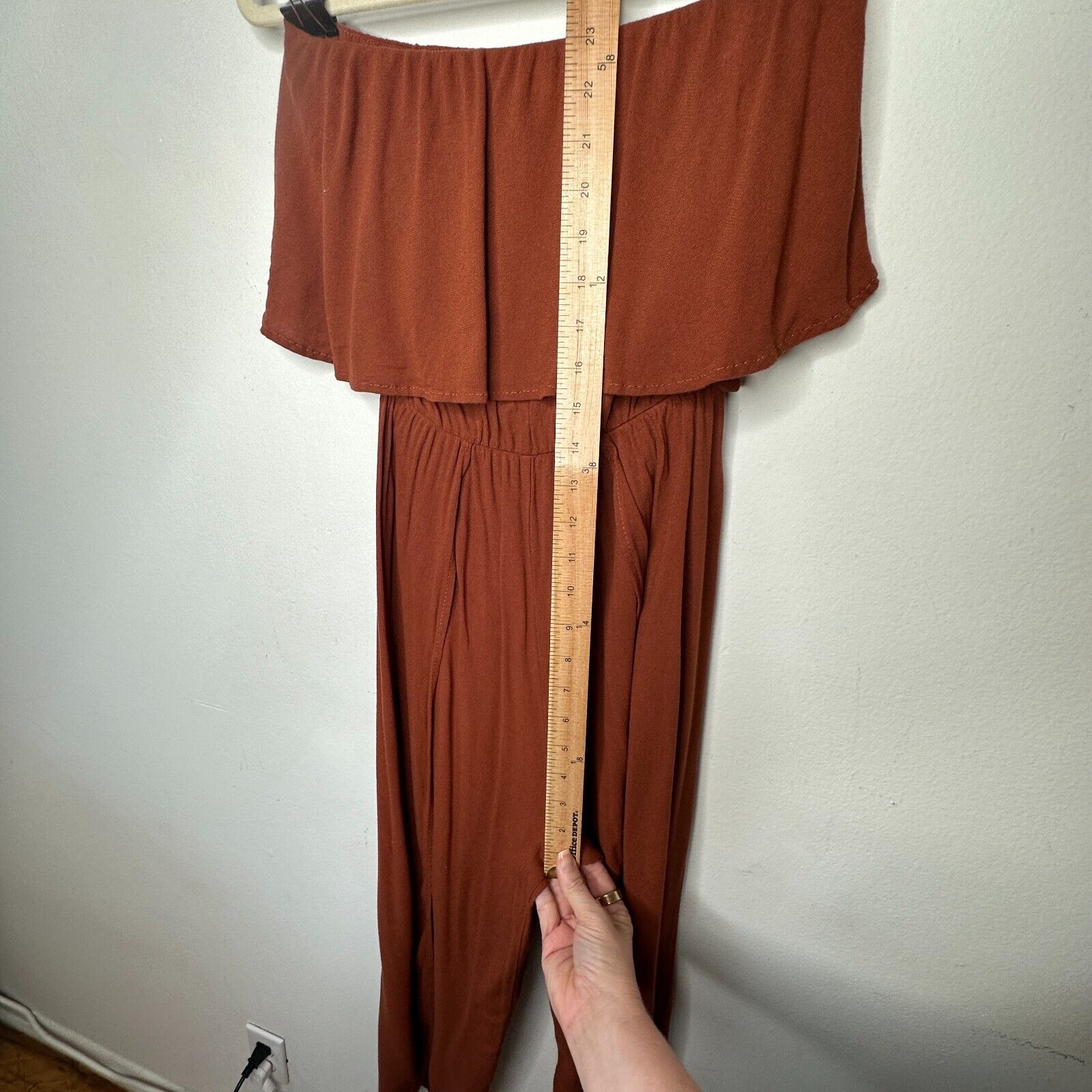 Angl Rust Bronze Brown Bandeau Ruffle Off Shoulder Top Harem Slit Pant elastic stretch waist Jumpsuit Romper