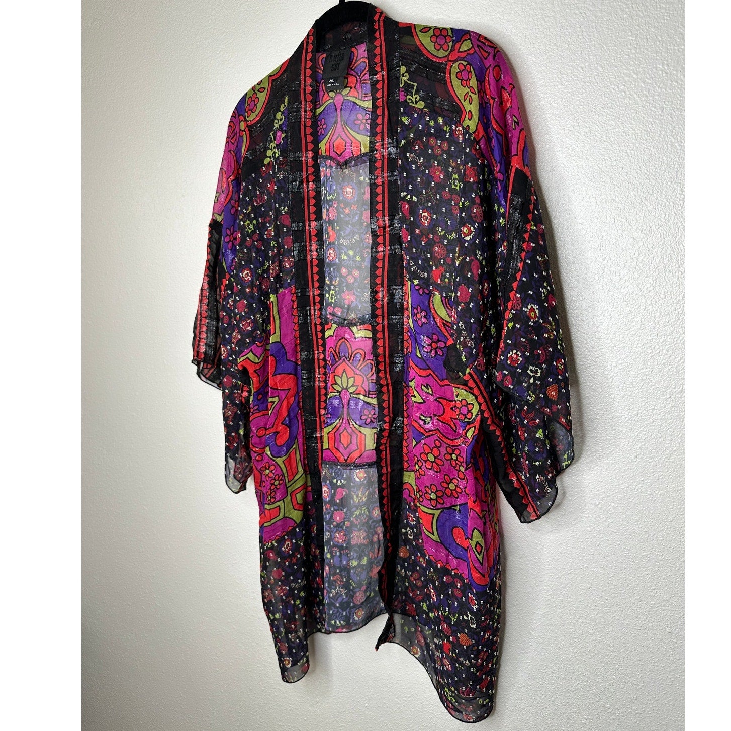 Anna Sui Multicolor Pink Black Purple Sheer Shimmer Floral Paisley Kimono M / L