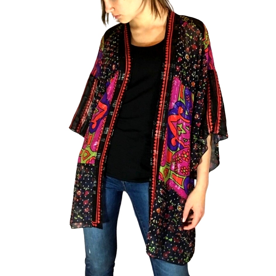 Anna Sui Multicolor Black Purple Magenta Green Sheer Metallic Shimmer Floral Paisley Open Kimono