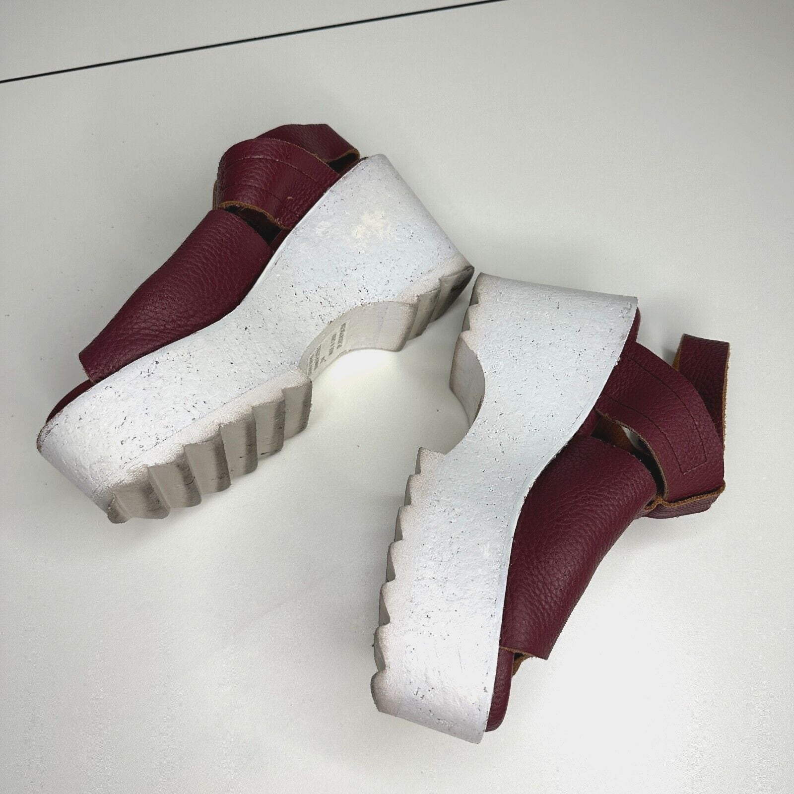 Anthro Gee Wawa Eggplant Leather White Platform Open Toe Ankle Strap Sandals 8