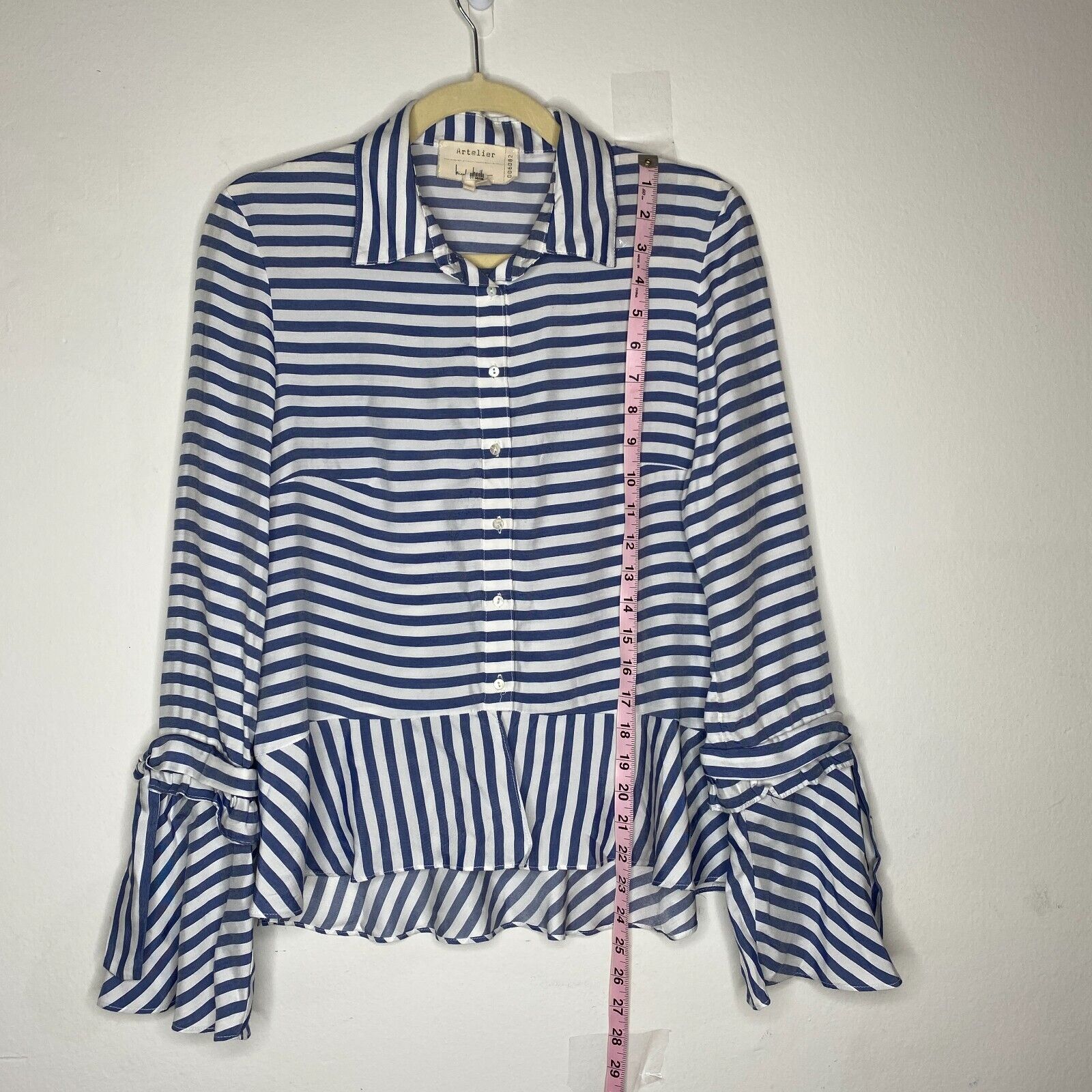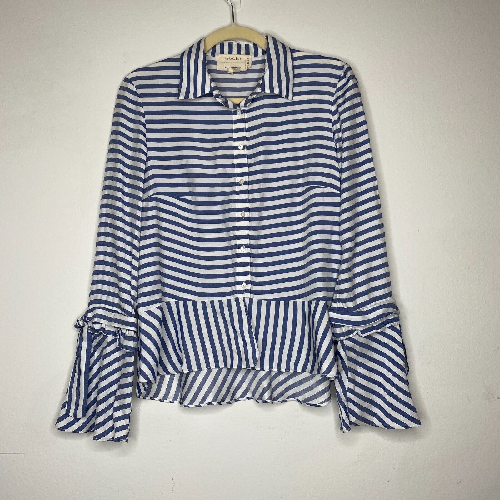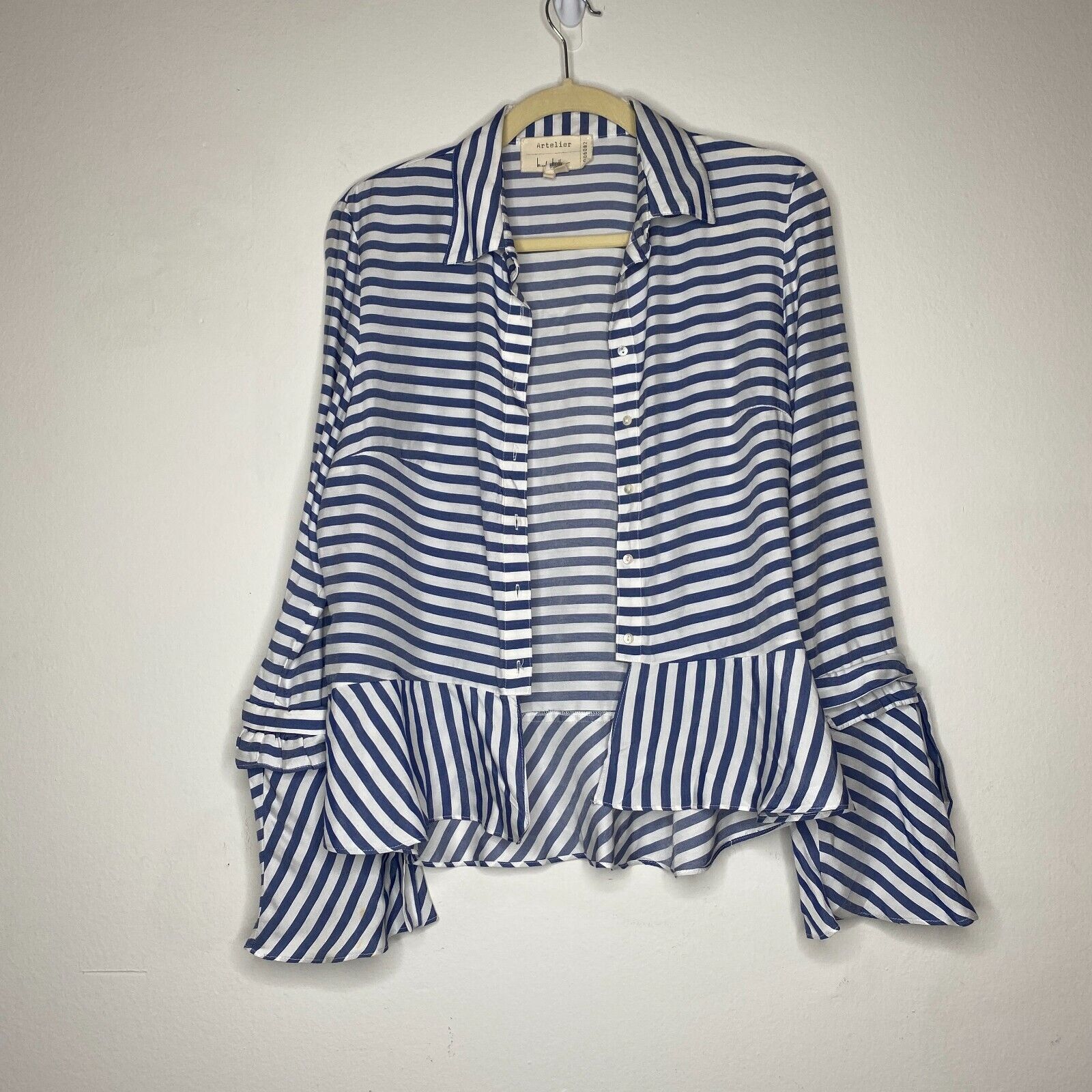 Artelier Blue and White Stripe Collar Button Down Bell Tie Sleeve Blouse XS
