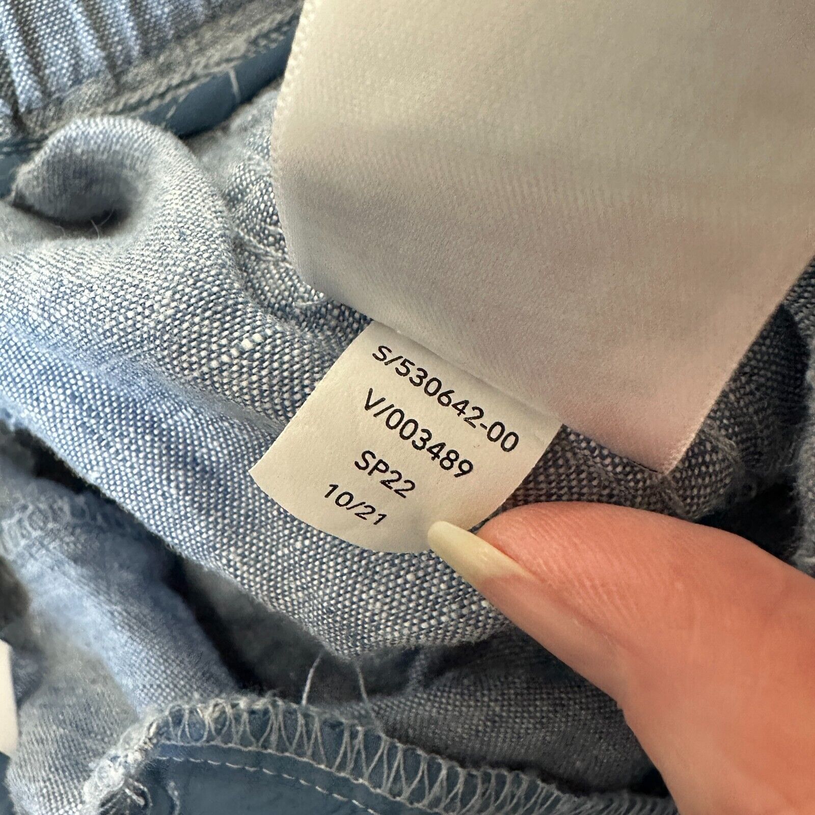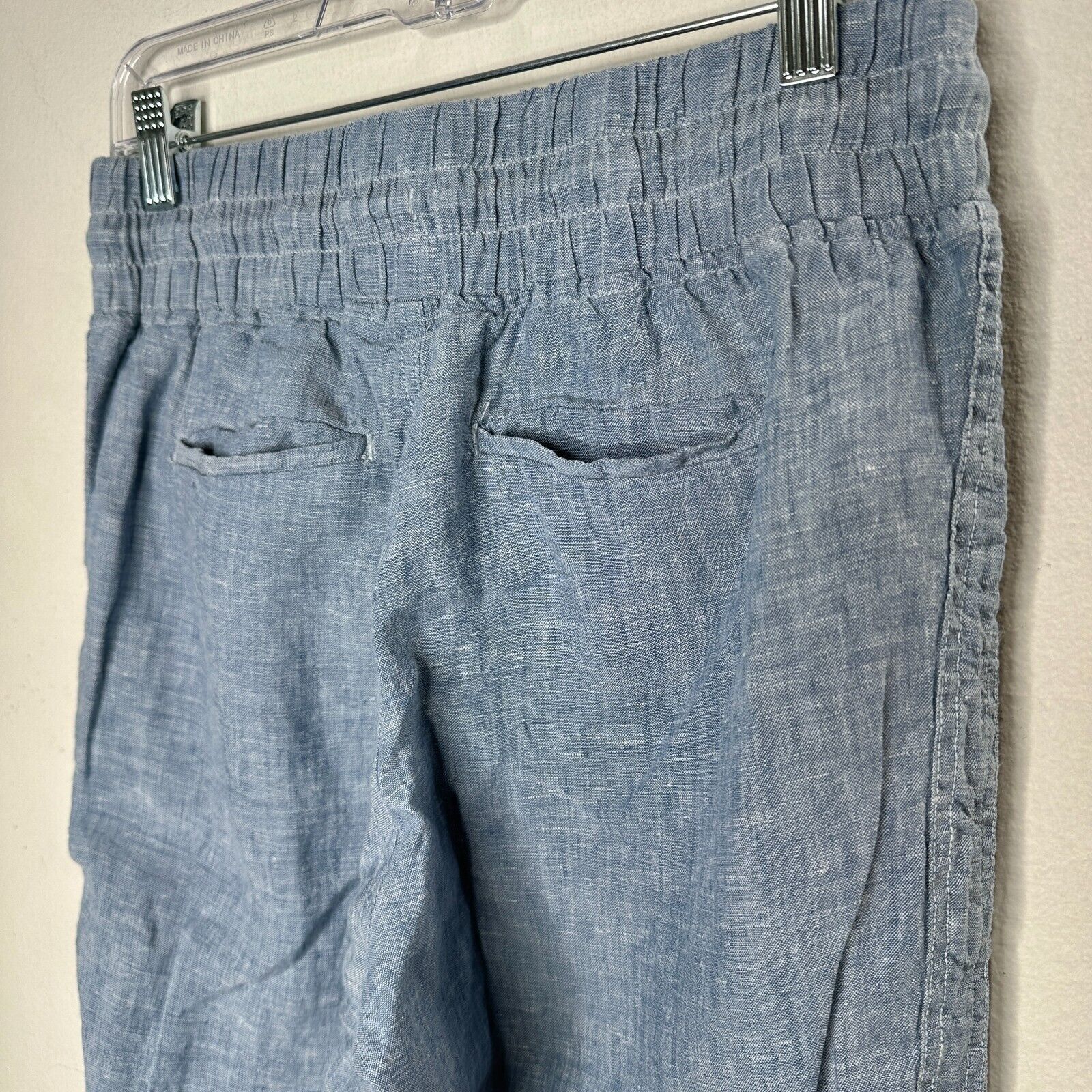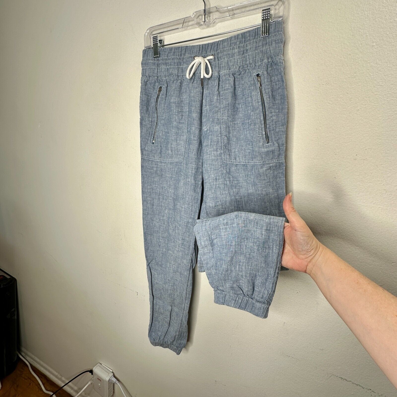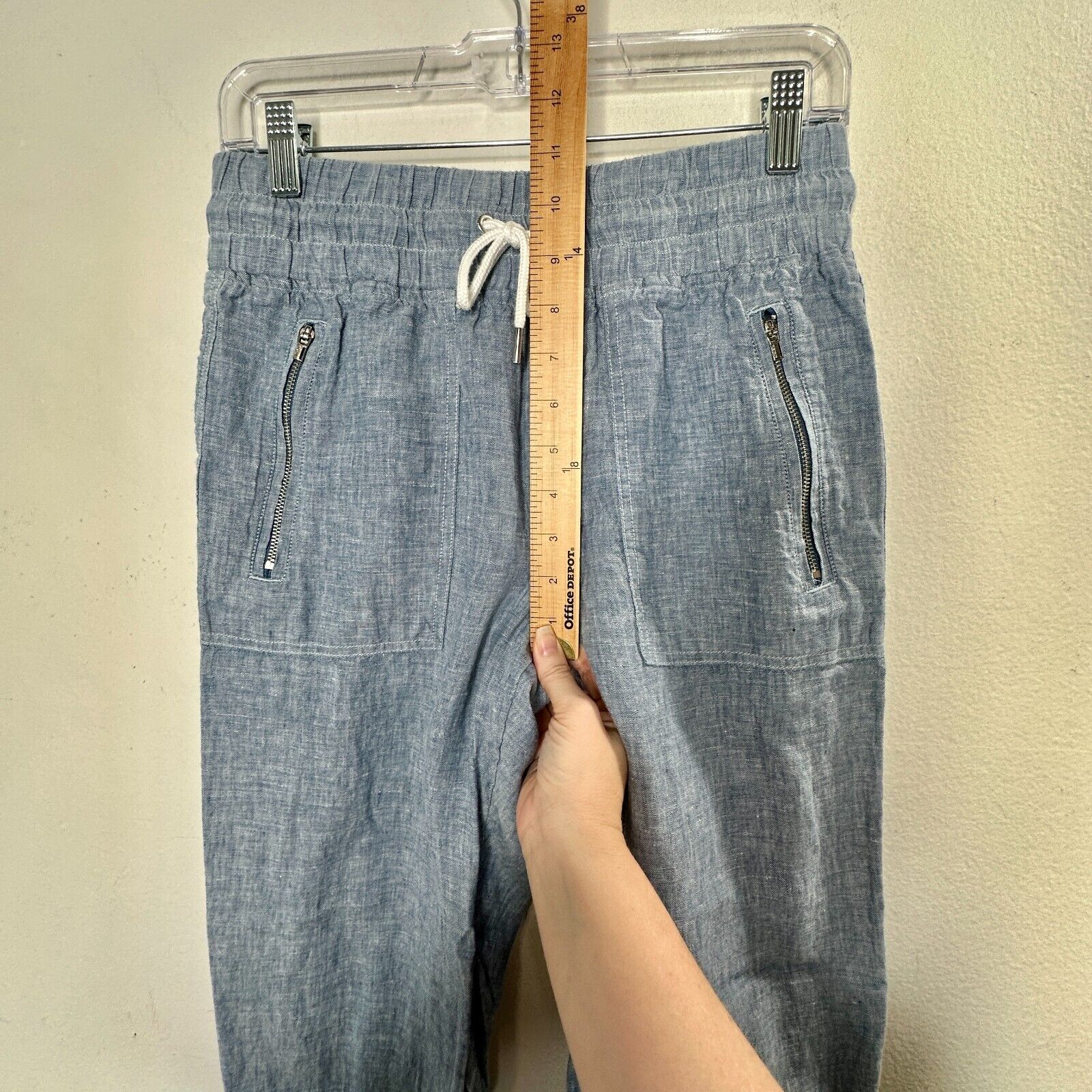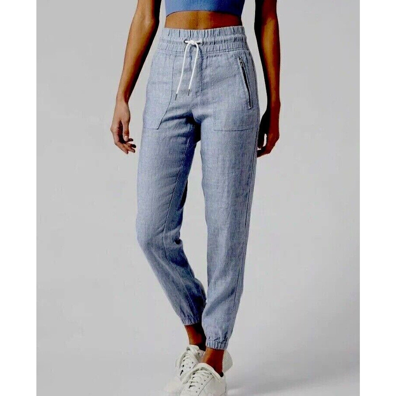 Athleta Chambray Blue Cabo Linen Jogger Pants Elastic Tie Waist Front Zip Pockets