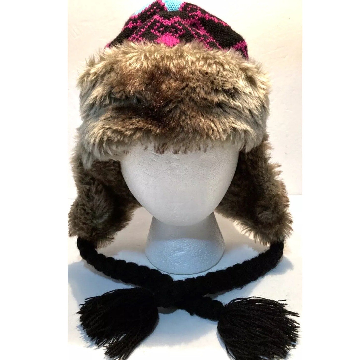 Billabong Pink Black Blue Multi-color Knit Faux Fur with Ear Flaps & Braids Trapper Hat