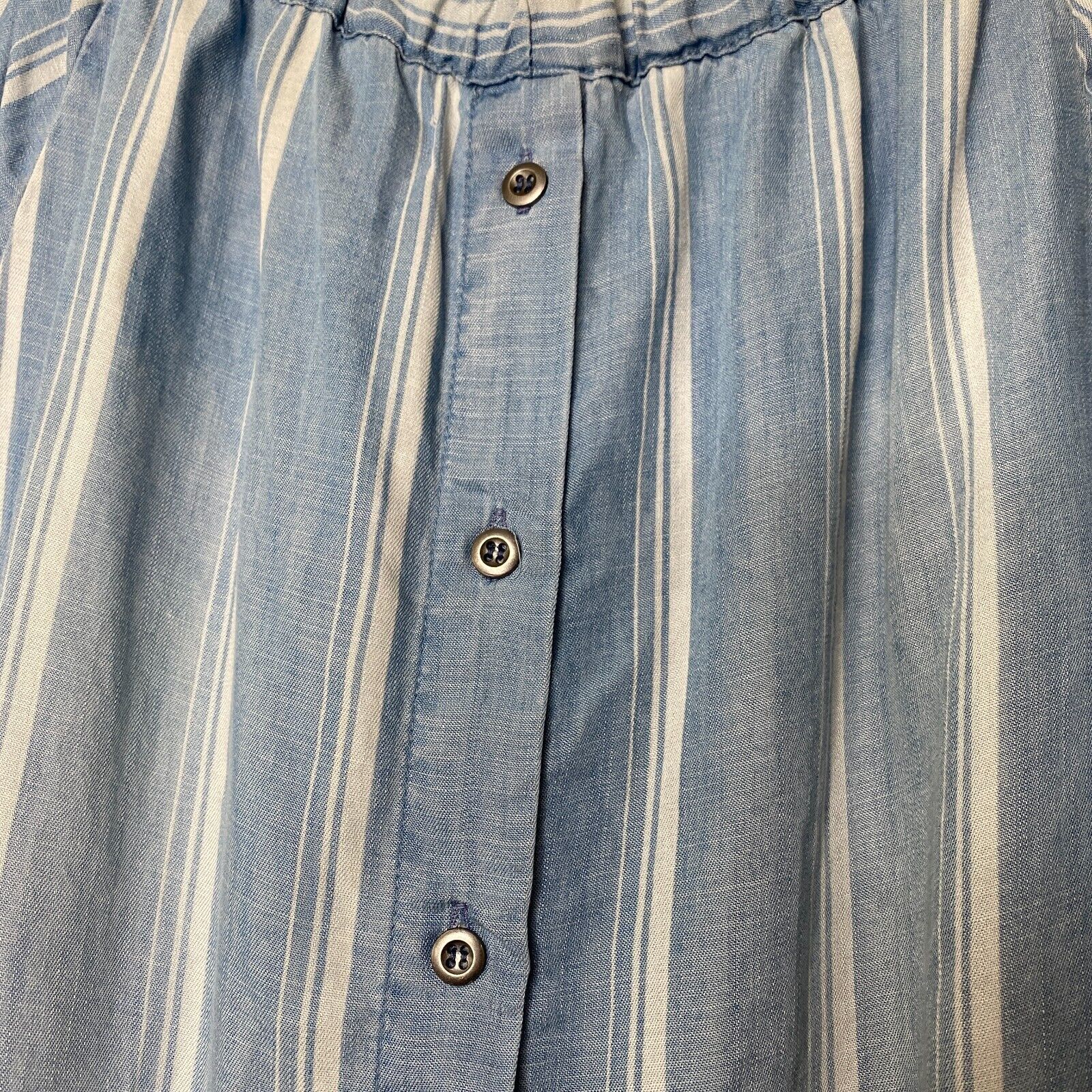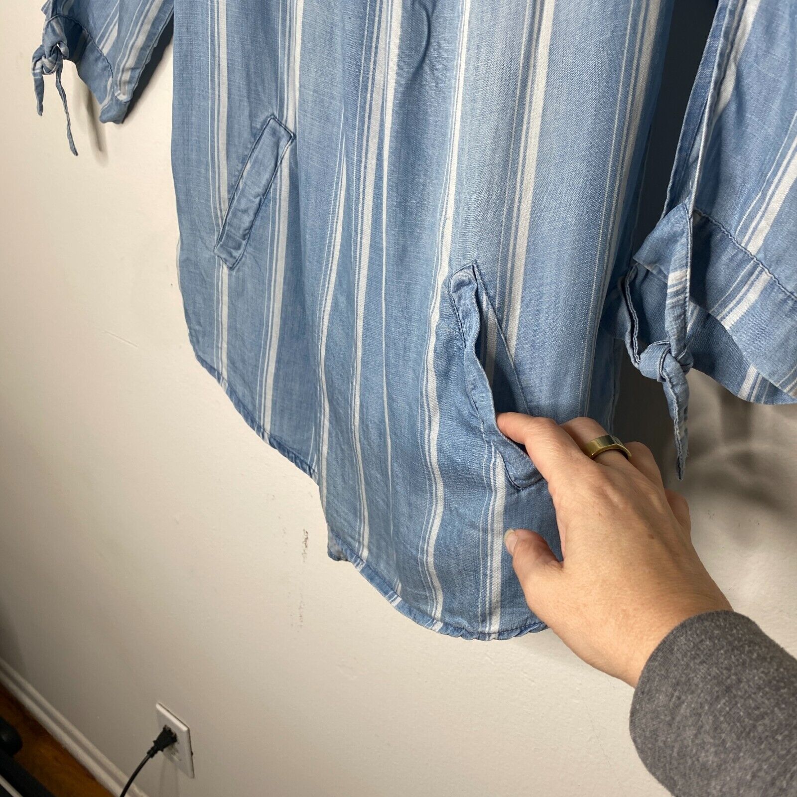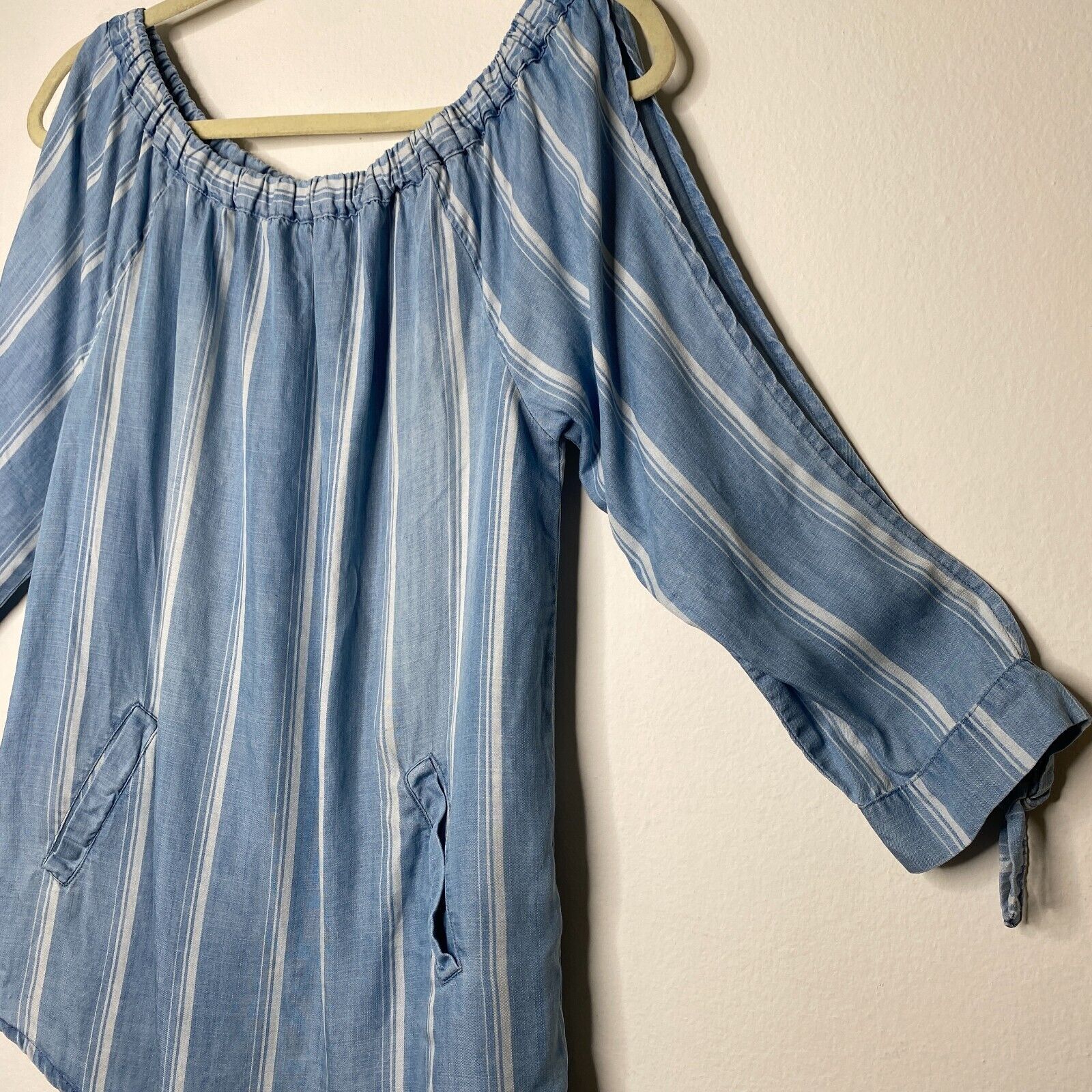 Billy T Denim Blue & White Striped Linen Off Shoulder Tunic 2 Front Pockets 3/4 Tie At Cuff Split Sleeve Back Button Embellishment Top Blouse