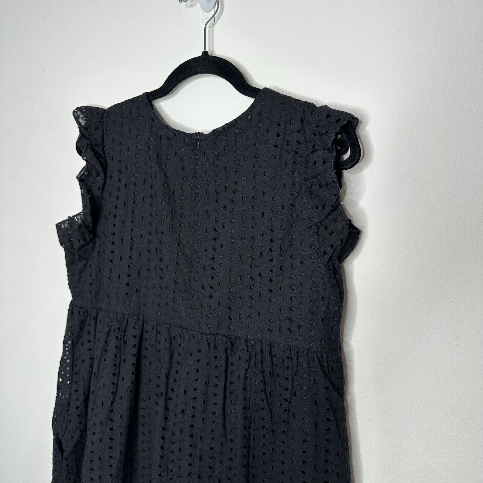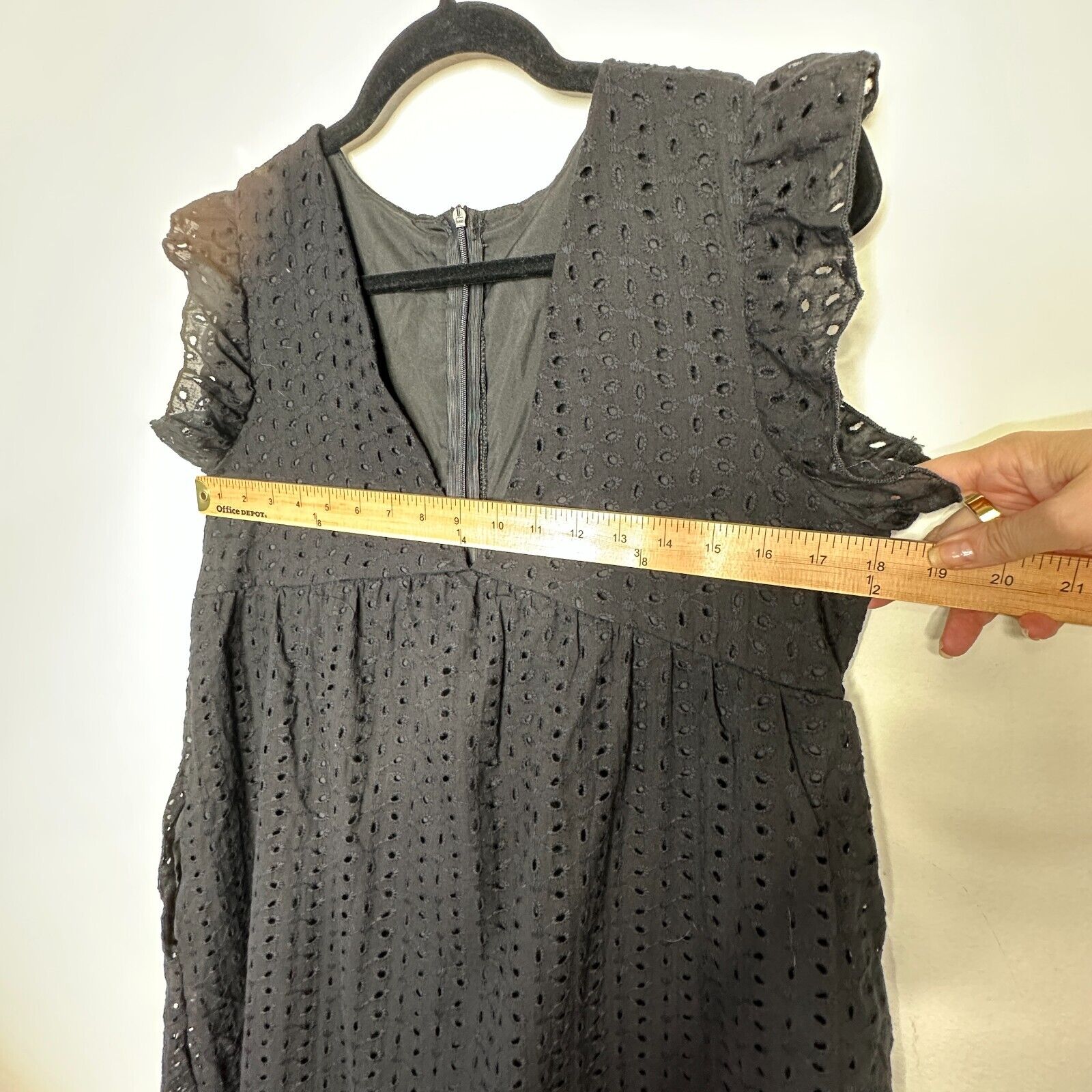 Elevate your wardrobe with this stunning Black Eyelet Lace Deep V-Neck Zip Sleeveless Romper Mini Dress Empire Waist M. Featuring a deep V-neckline and eye-catching eyelet lace detailing, this dress exudes femininity and sophistication. The sleeveless design allows for unrestricted movement, while the empire waist creates a flattering hourglass silhouette.