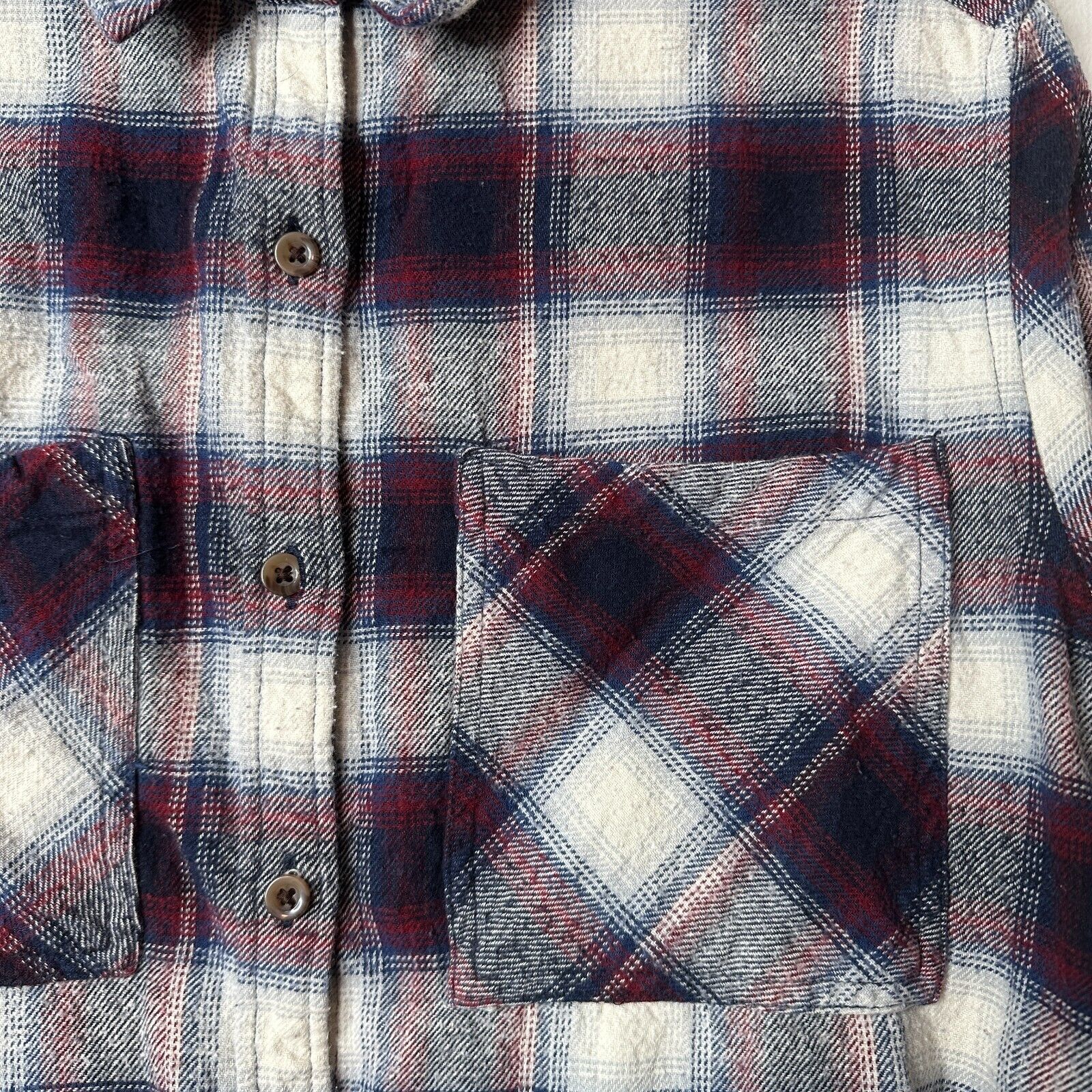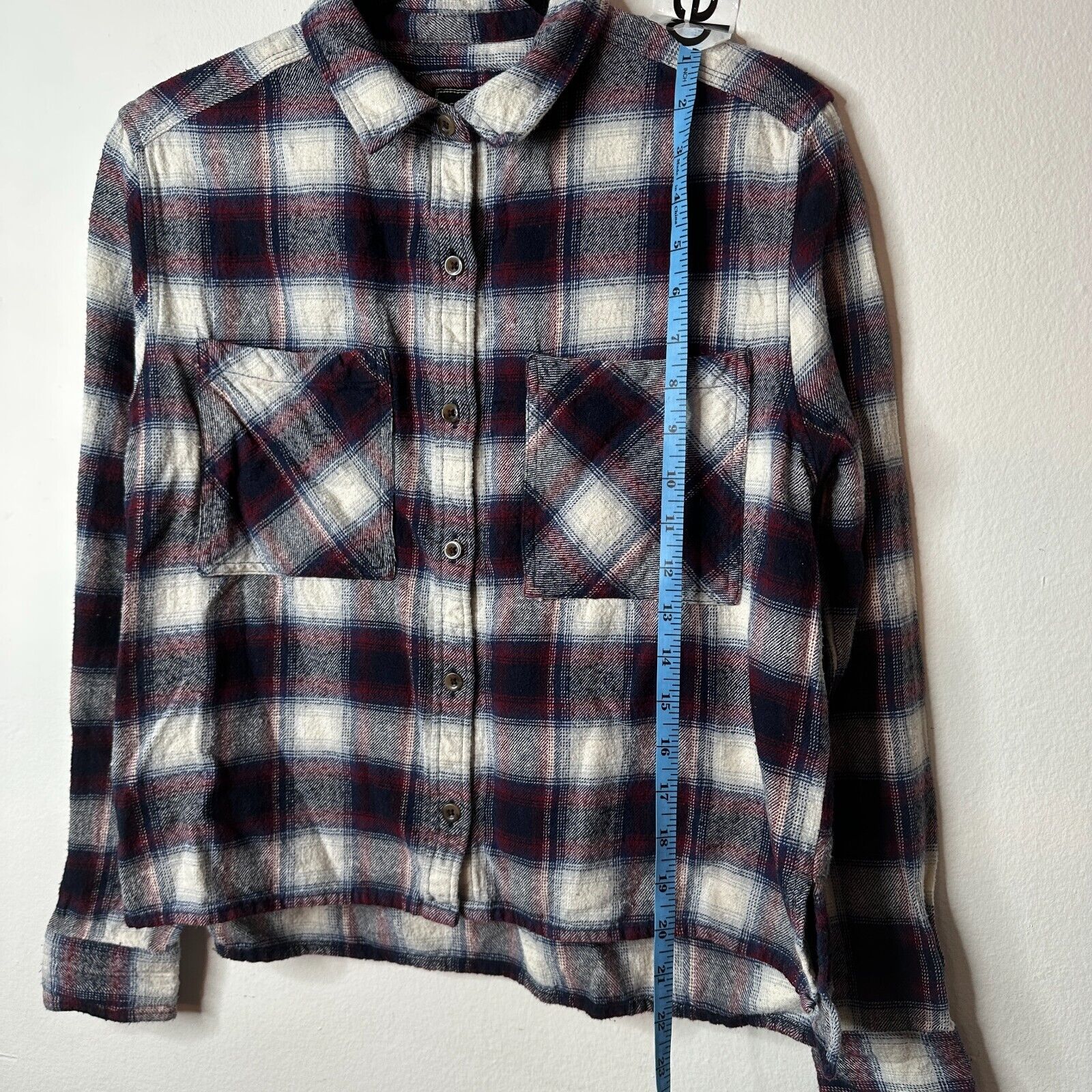 Black Red Blue White Plaid Cropped Long Sleeve Flannel Button Down Shirt M