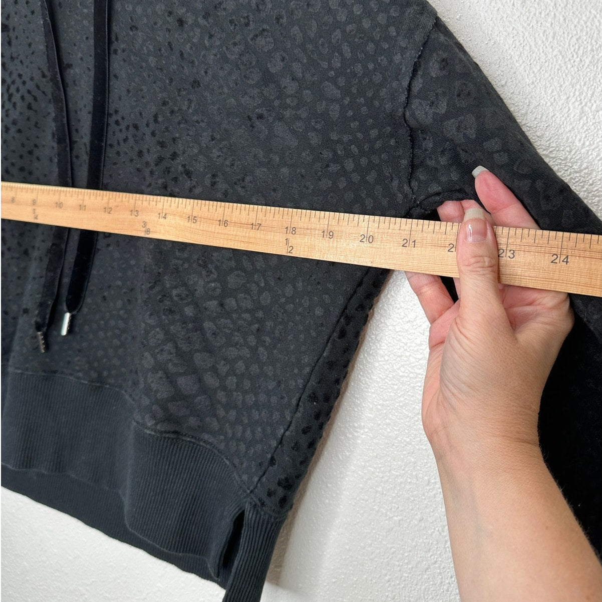 Black Tape Worn Black Pullover Hooded Long Sleeve Cheetah Print Embossed Design Cropped Banded Split Hem Hoodie
