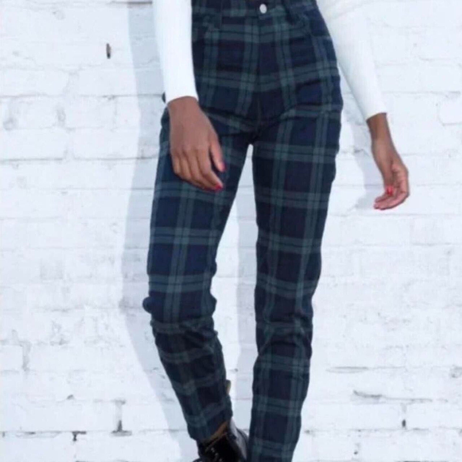 Brandy Melville John Galt Blue Green Plaid High Waist Zip Button Trouser Pant SM