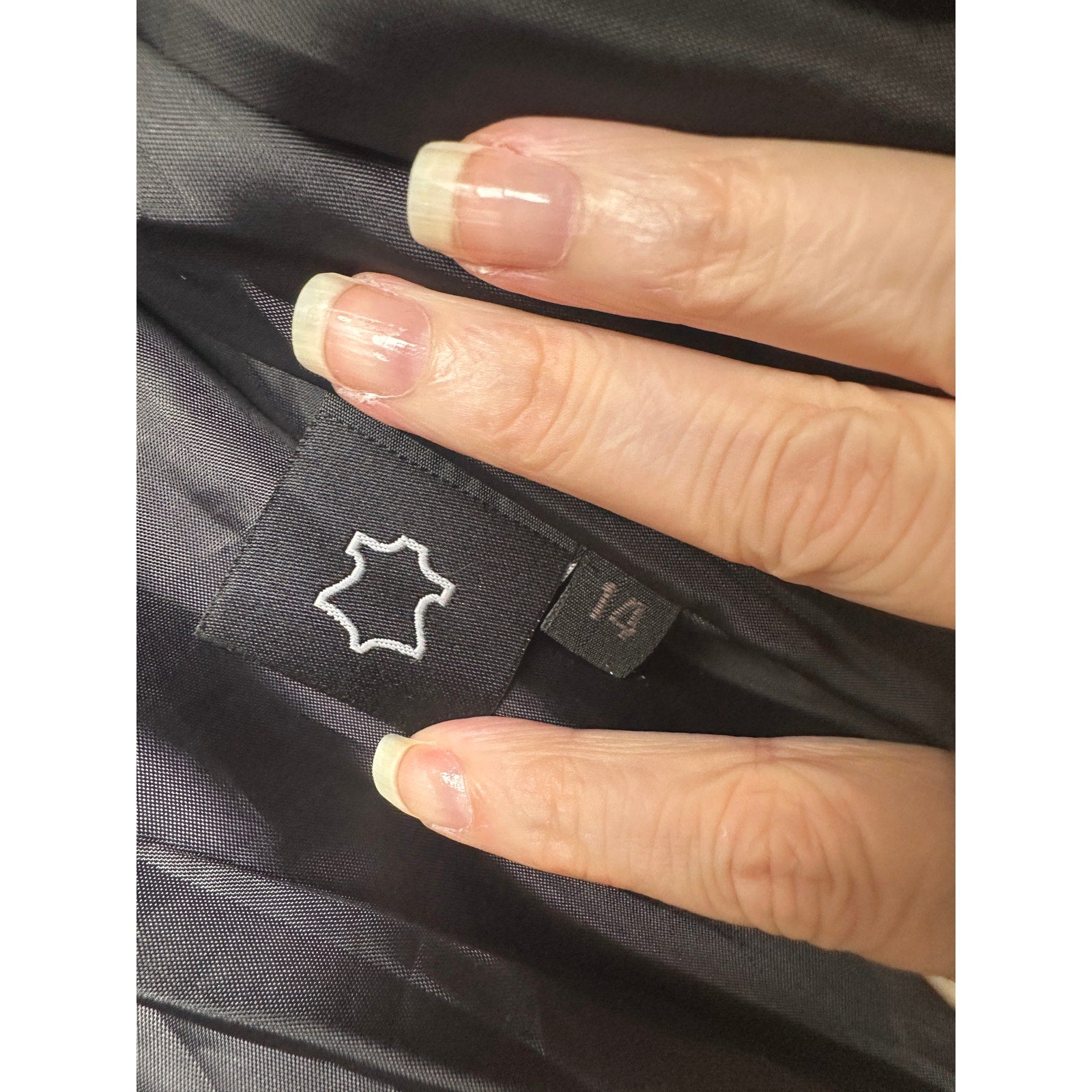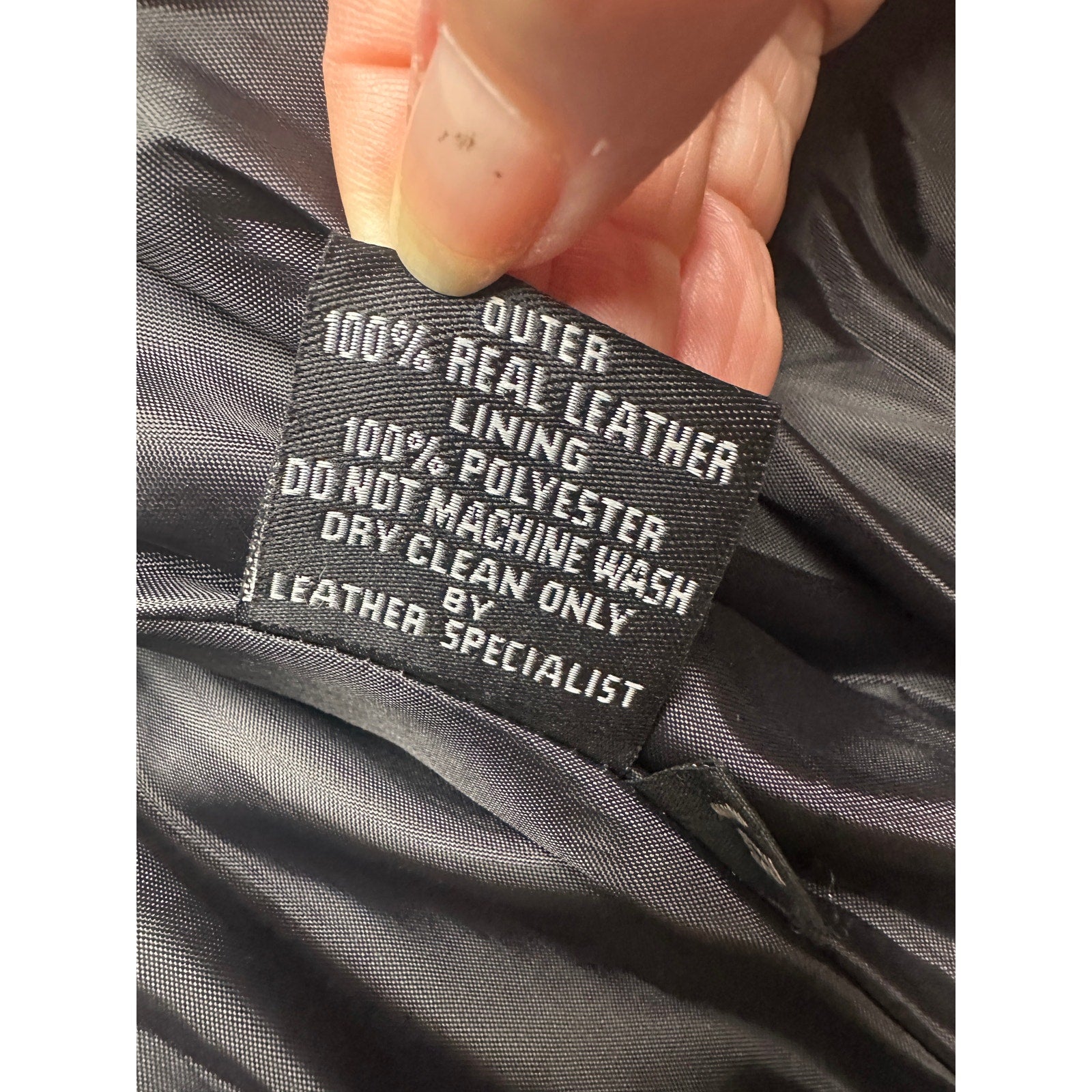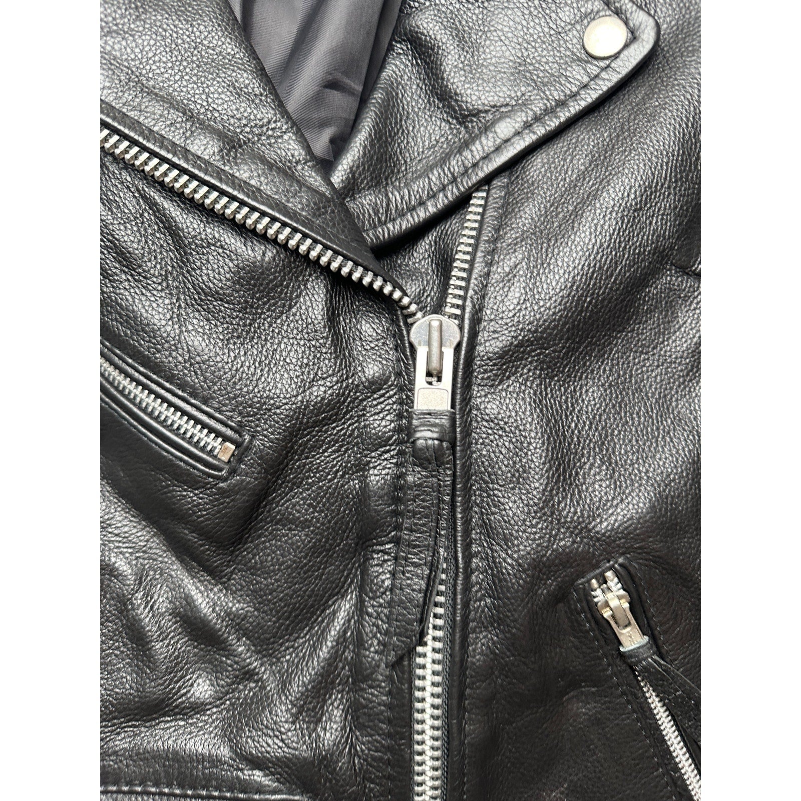 Asymmetrical front zip with snap lapels, shoulder epaulets, and silver-tone hardware. Multiple zip pockets plus a coin flap pocket, zip cuffs, and an adjustable belted waist. Genuine leather shell with smooth polyester lining for easy layering. Hip-length moto silhouette works with denim, dresses, or concert and night-out looks. Care per tag: dry clean by leather specialist only. Outer: 100% real leather; lining: 100% polyester.