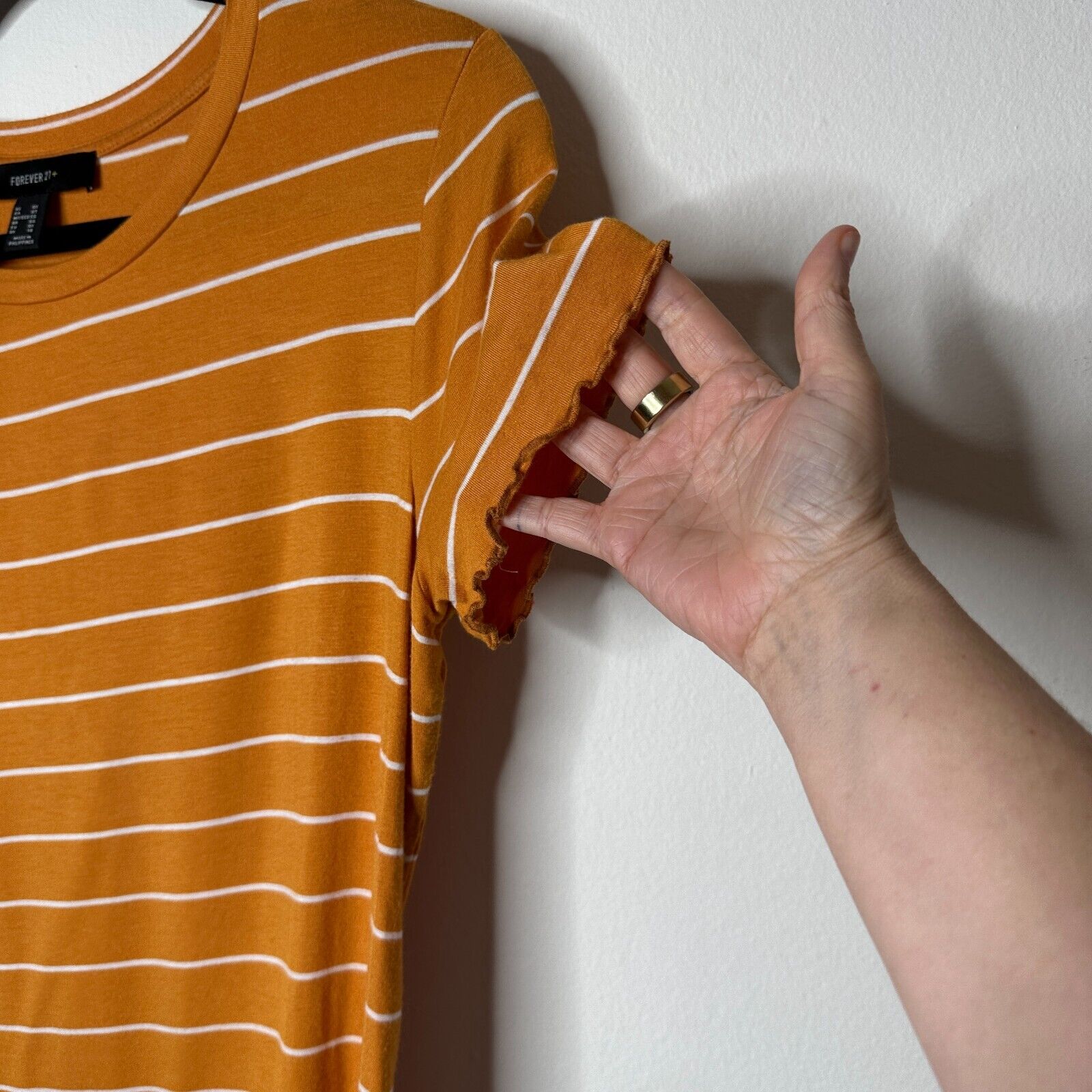 Add a pop of color to your everyday wardrobe with this vibrant Orange & White Striped Short Sleeve Tee from Forever 21. The scallop edges and round neck add a unique touch to this classic piece. Made from high-quality fabric, this tee offers comfort and durability, making it perfect for all-day wear. Whether you're dressing up or down, this versatile tee can be paired with jeans, skirts, or shorts for a stylish and effortless look. Stay on-trend with Forever 21's fashion-forward designs and make a statement wherever you go.