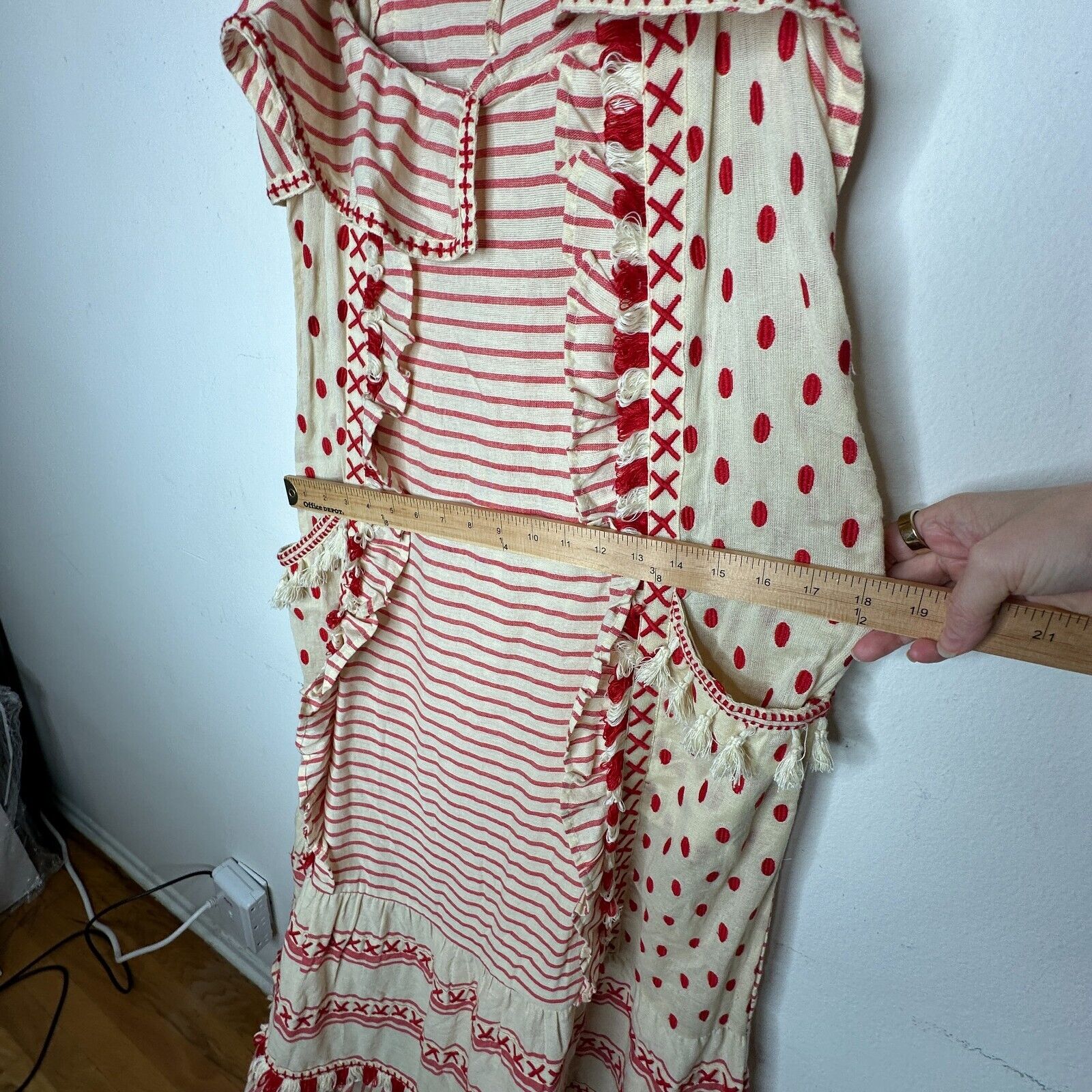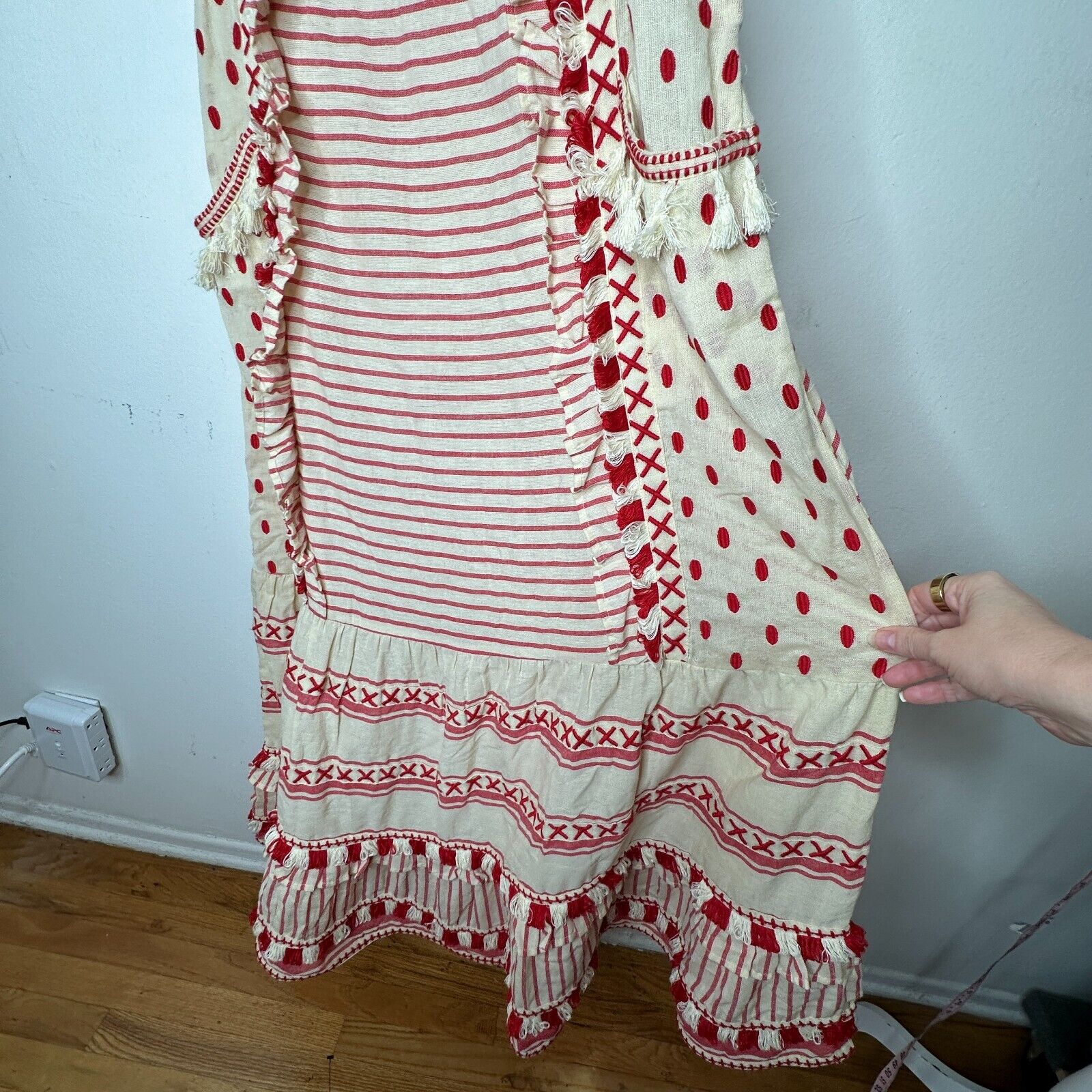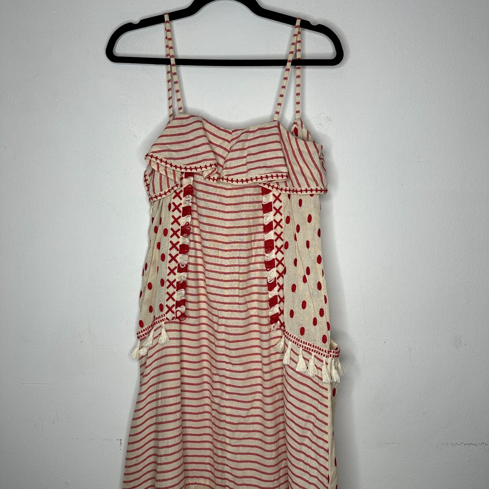DODO BAR OR Cute Tan & Red Striped Polka Dot Ruffle Fringe Maxi Sun Dress S