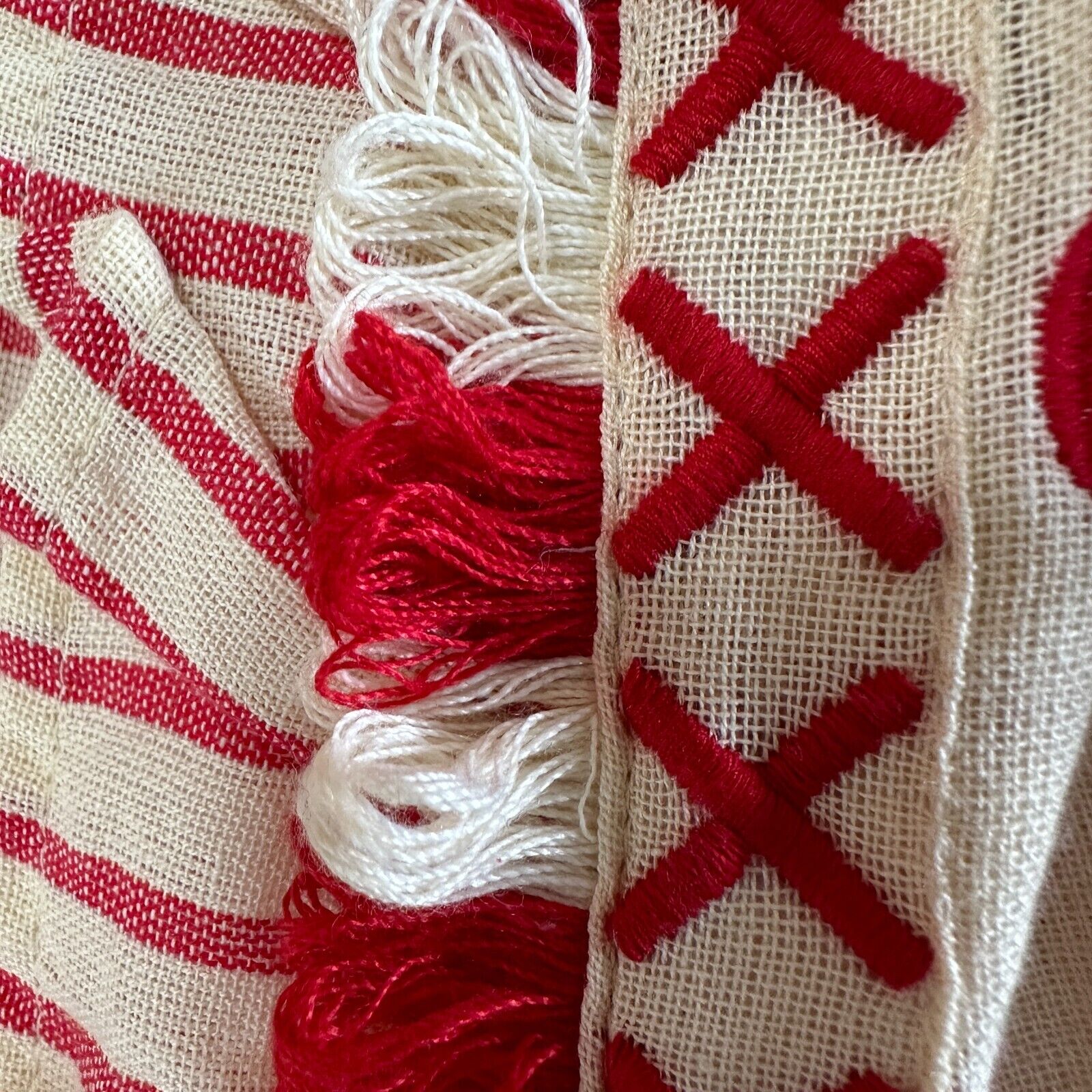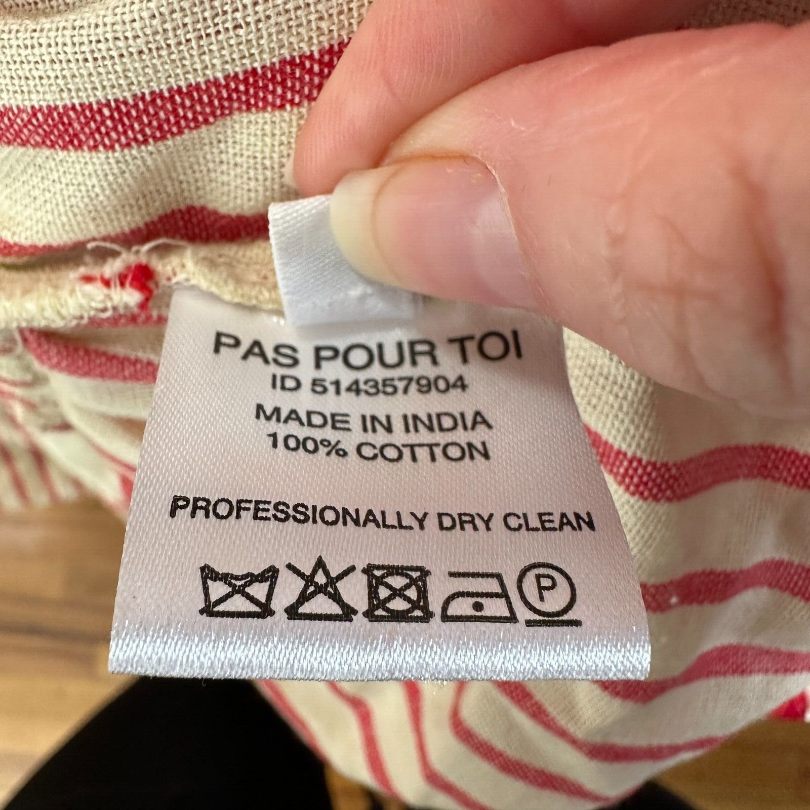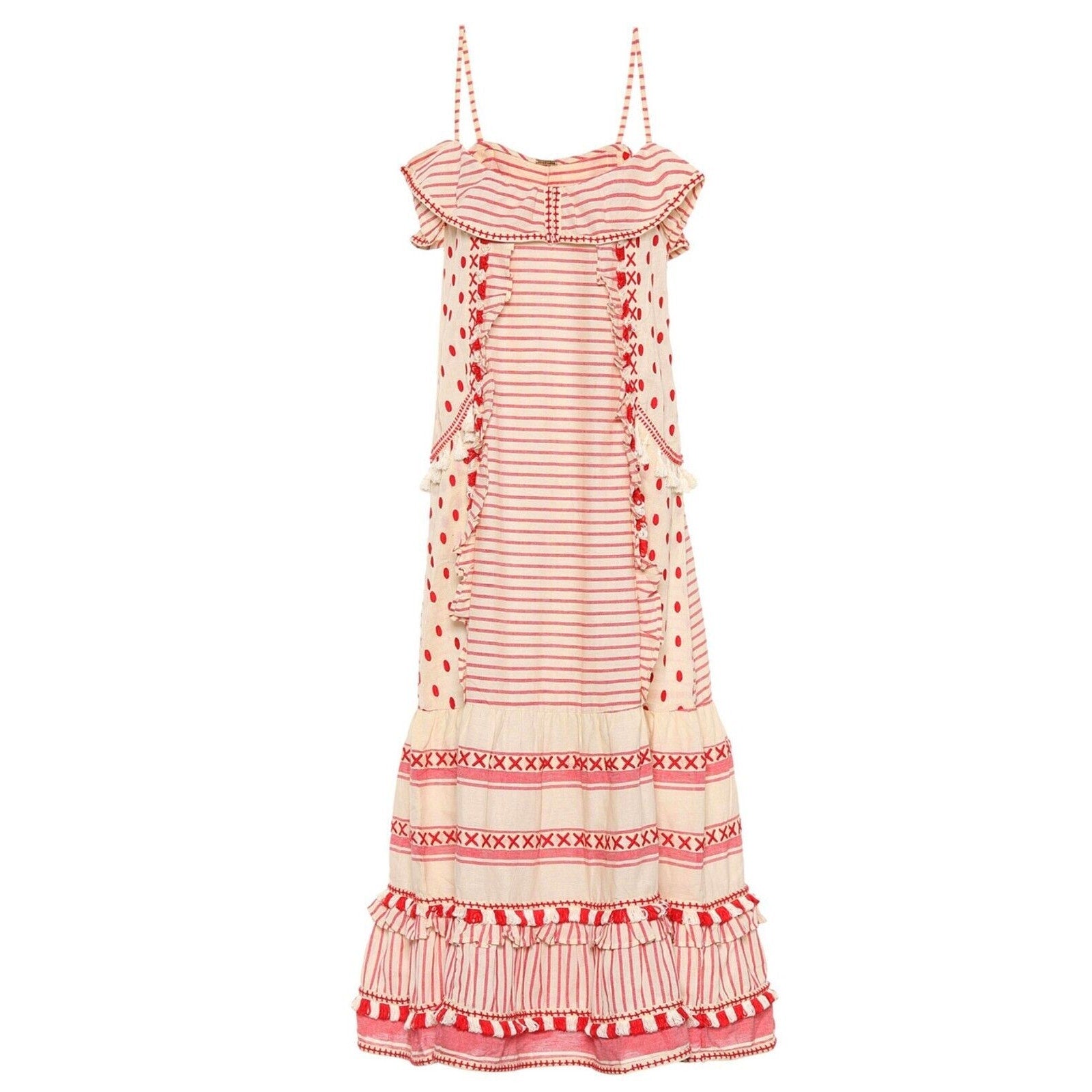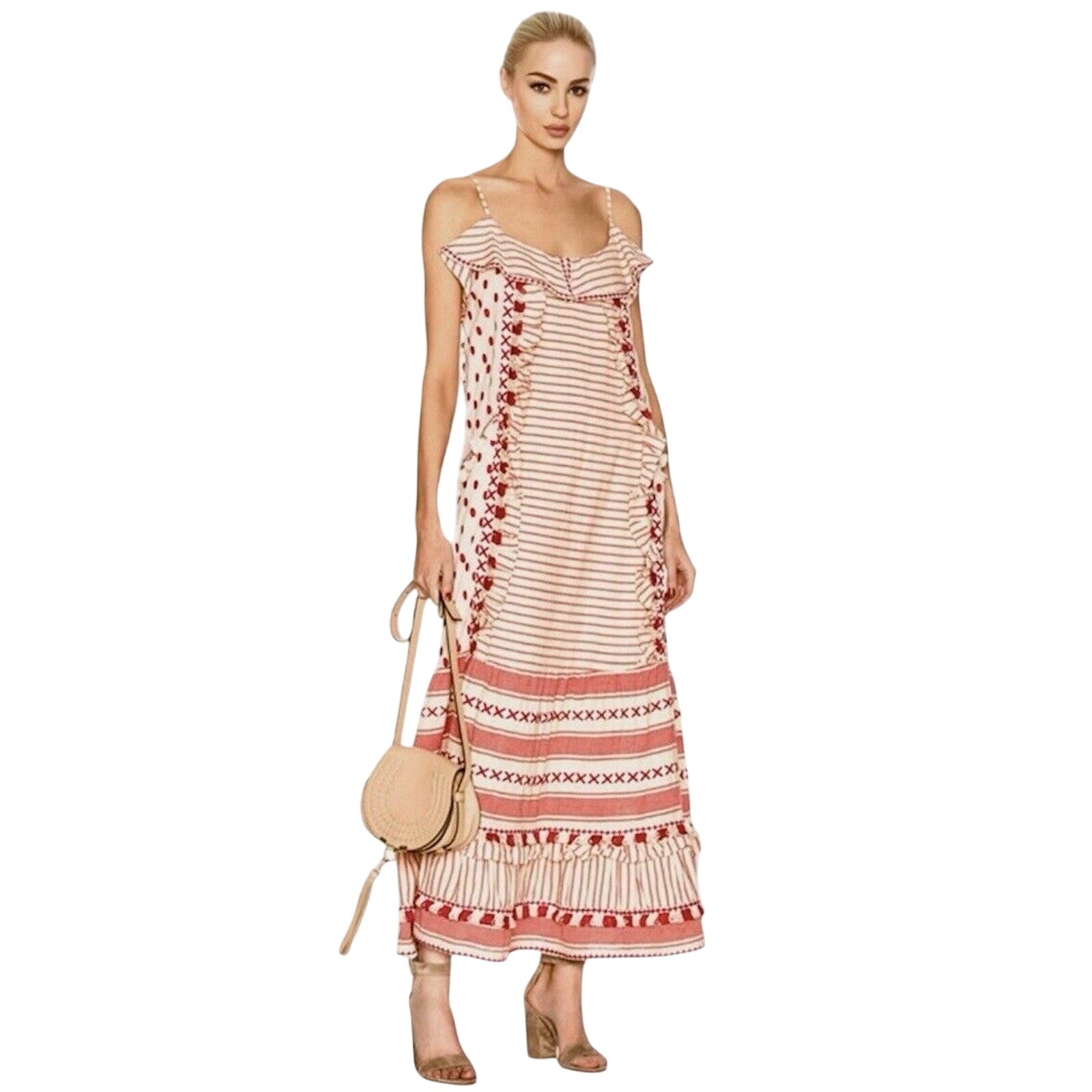 DODO BAR OR Tan & Red Striped Polka Dot Ruffled Maxi linen fringe Dress Spaghetti Straps Tan & Red