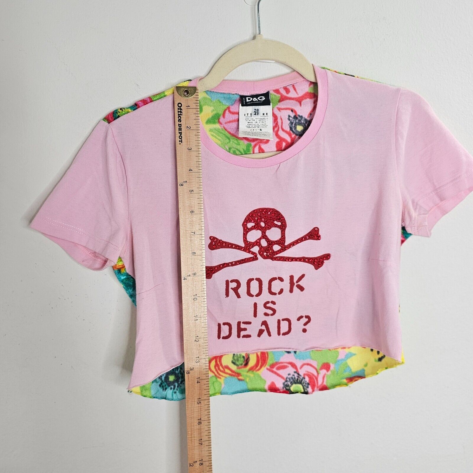 Dolce & Gabanna Pink with Red Rhinestone Skull Graphic & Rock Is Dead Graphic Hand Cut Short Sleeve Velour Crop Top Multi Color Floral Back