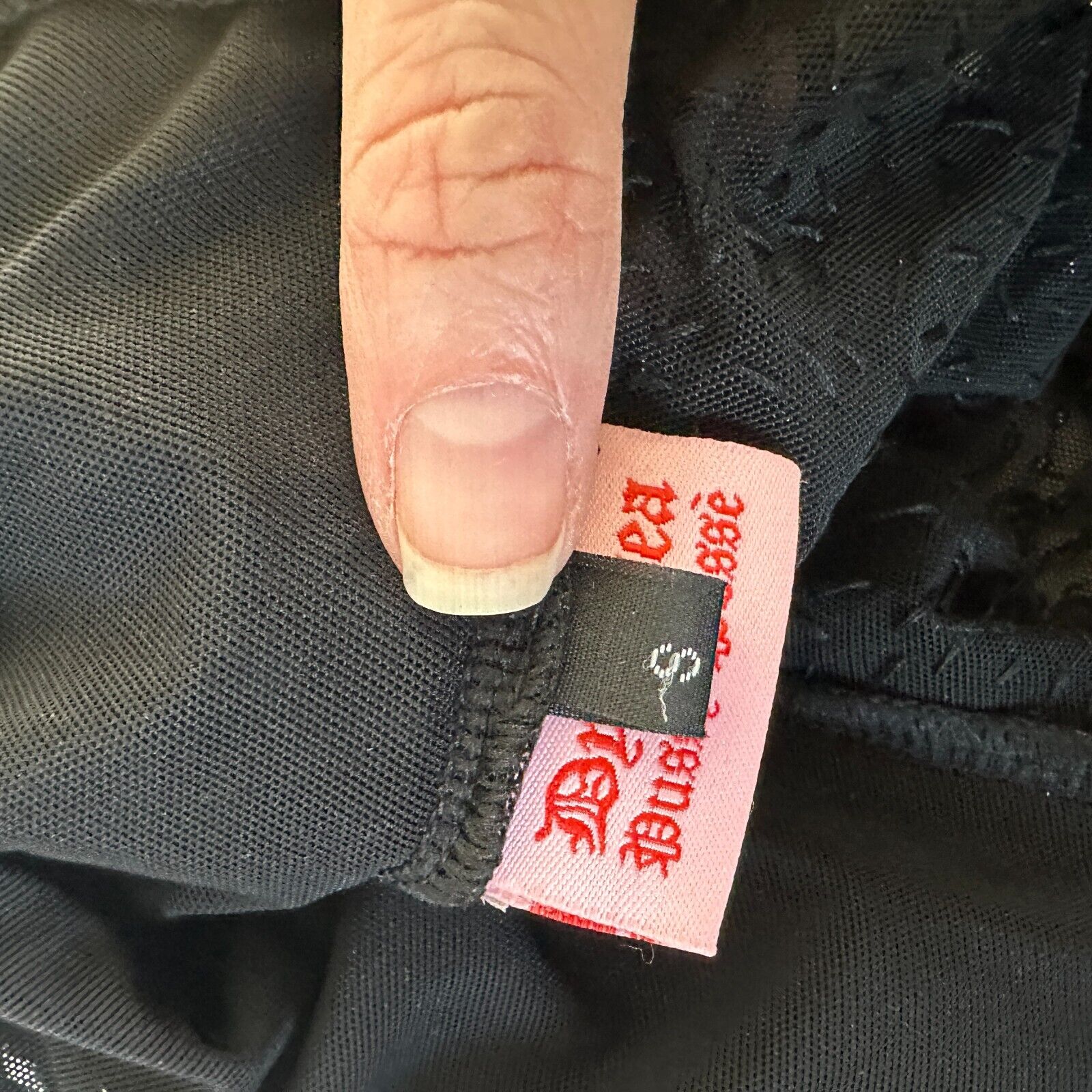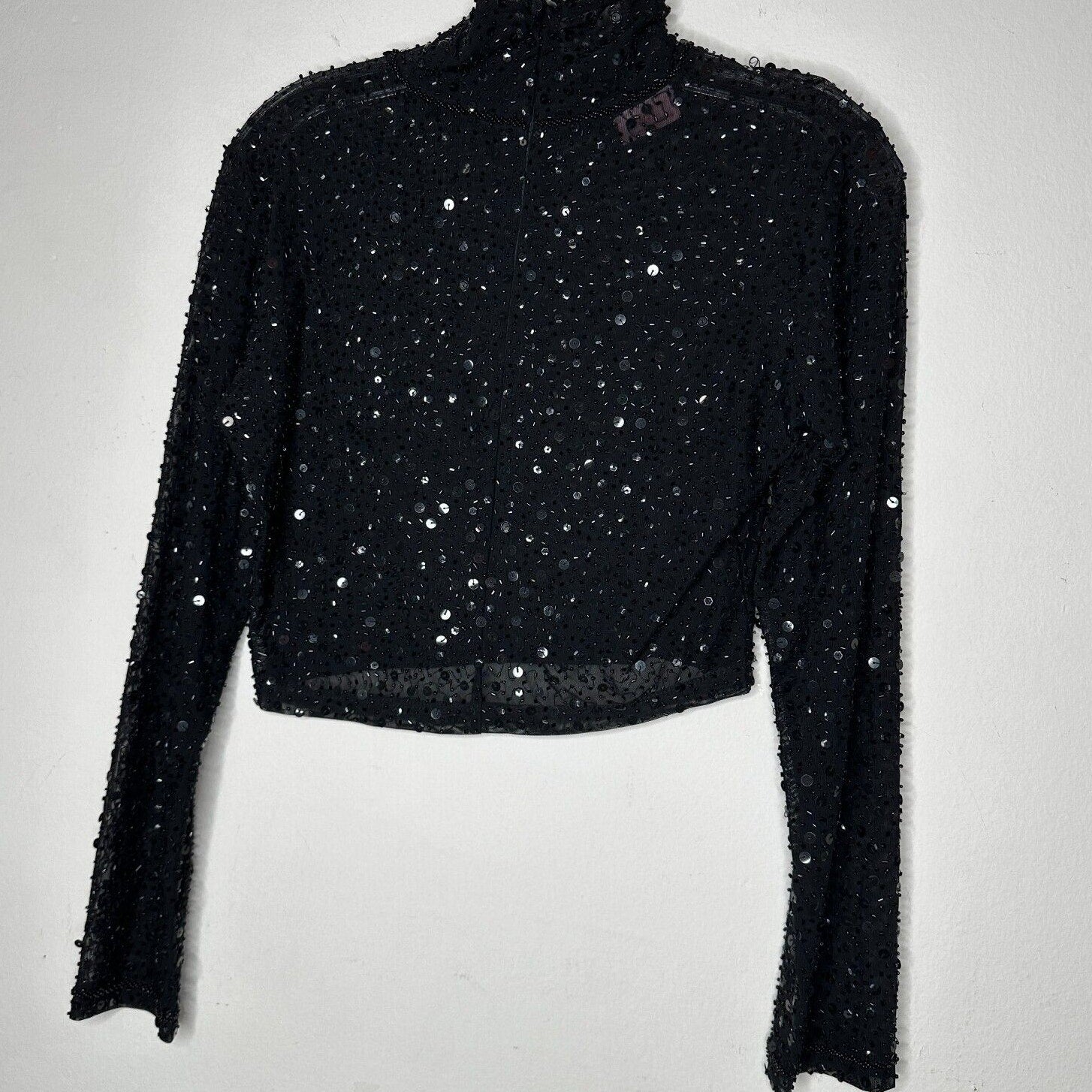 Dyspnea Sheer Black Sequin Mesh Mock Neck Long Sleeve Crop Top Hand Beaded Small