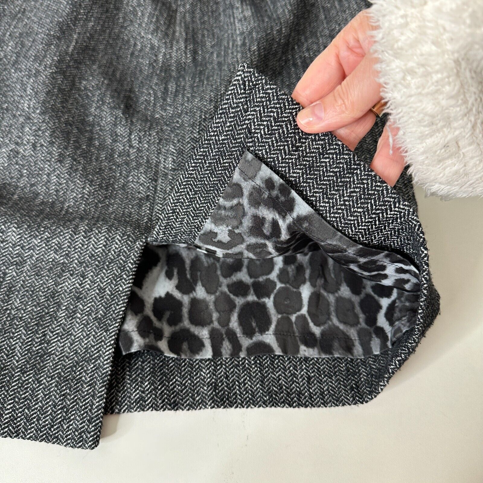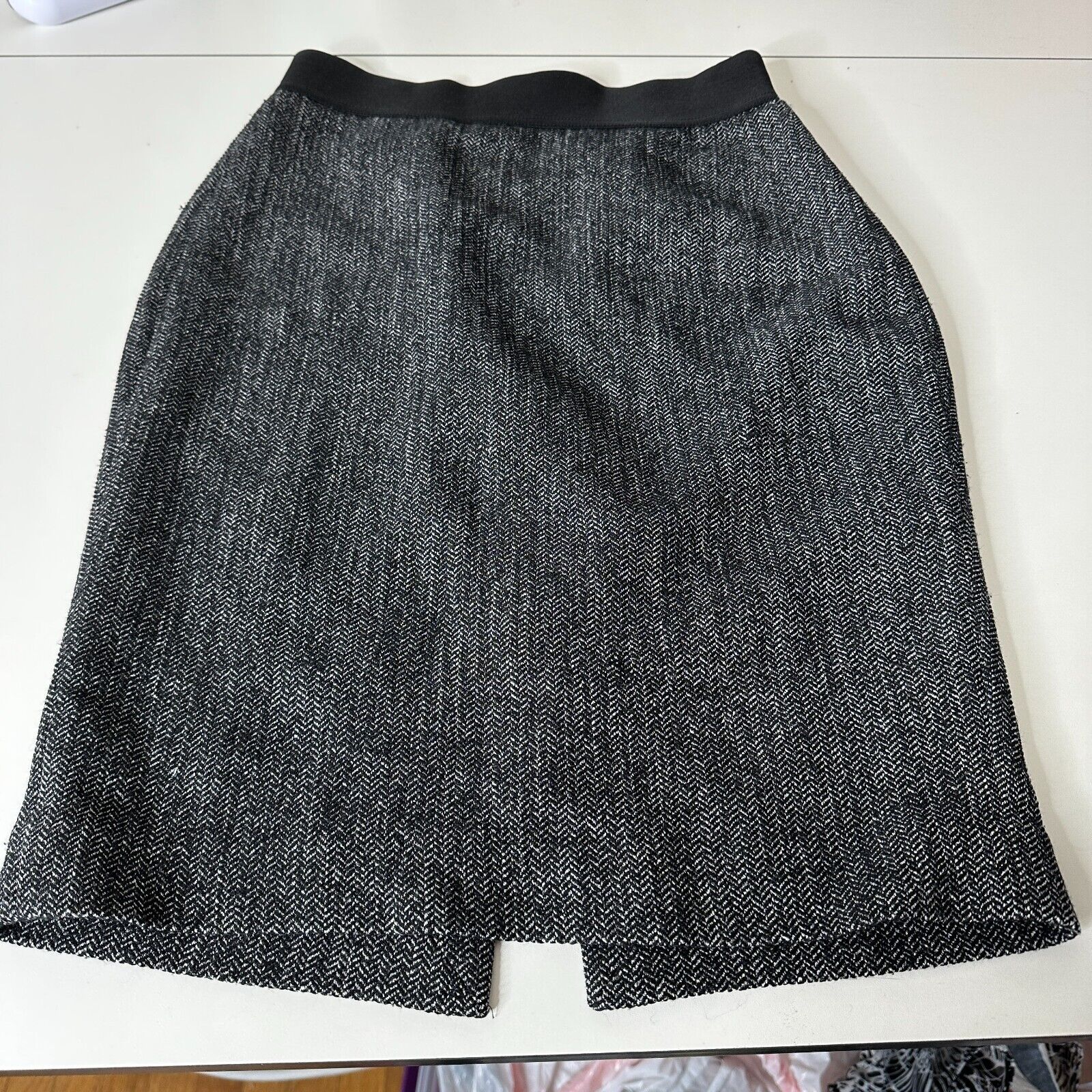 This skirt features a classic black and white houndstooth pattern and a sleek pencil silhouette, which is perfect for creating a polished and professional look. The skirt has a back zip closure and a slit at the back hemline, which allows for ease of movement and adds a touch of femininity to the design