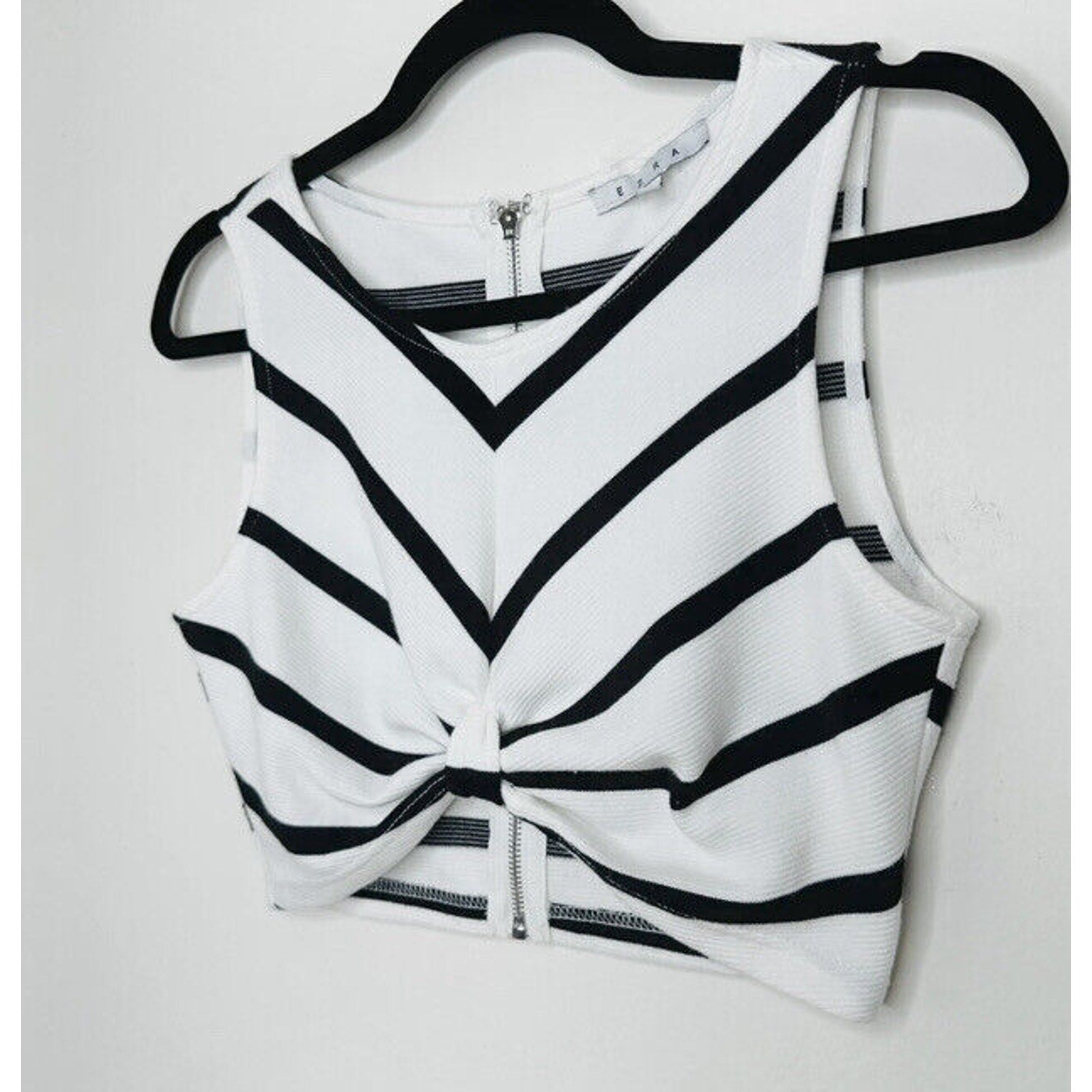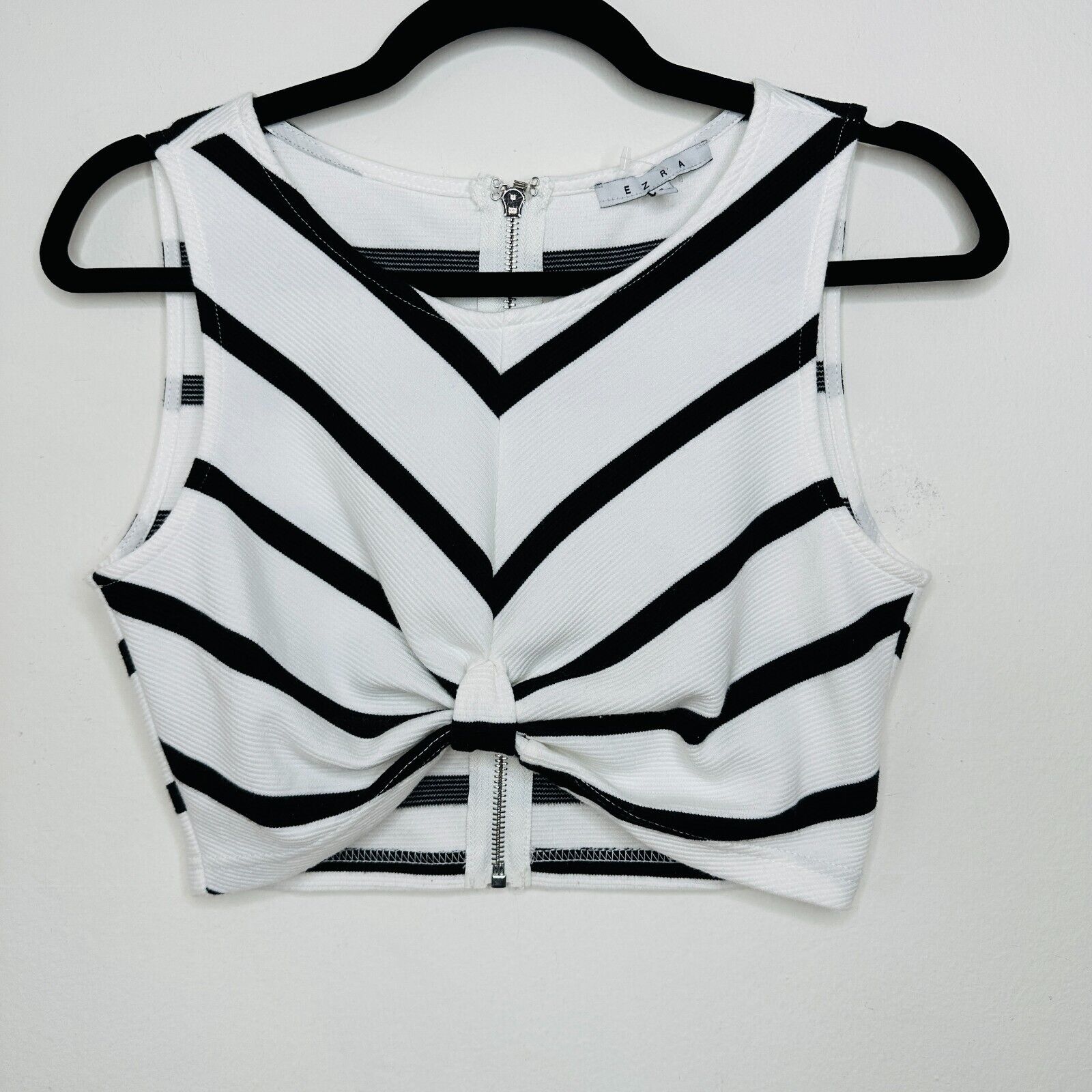 Ezra Black And White Striped Sleeveless Crop Top Gathered Front Knot Back Zip
