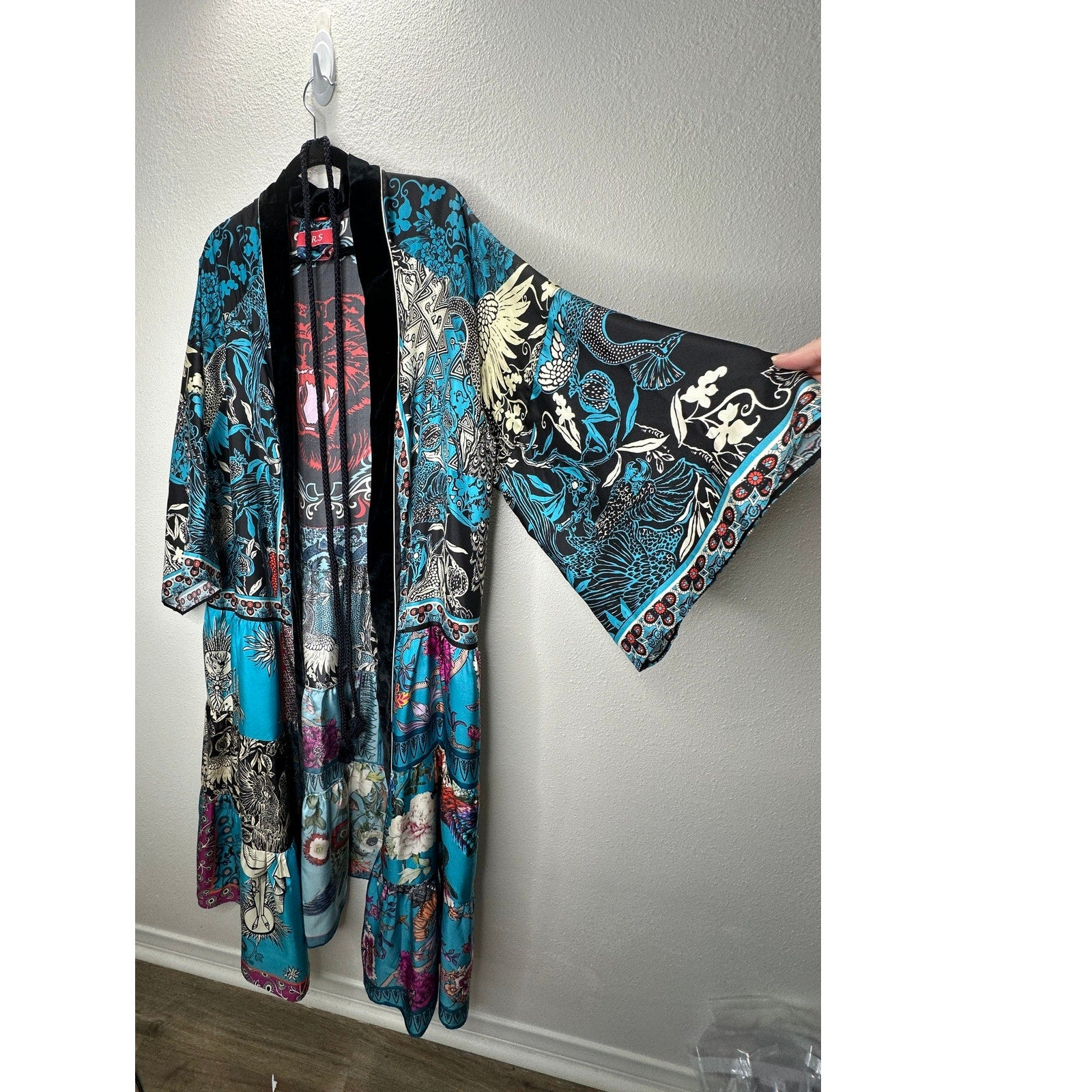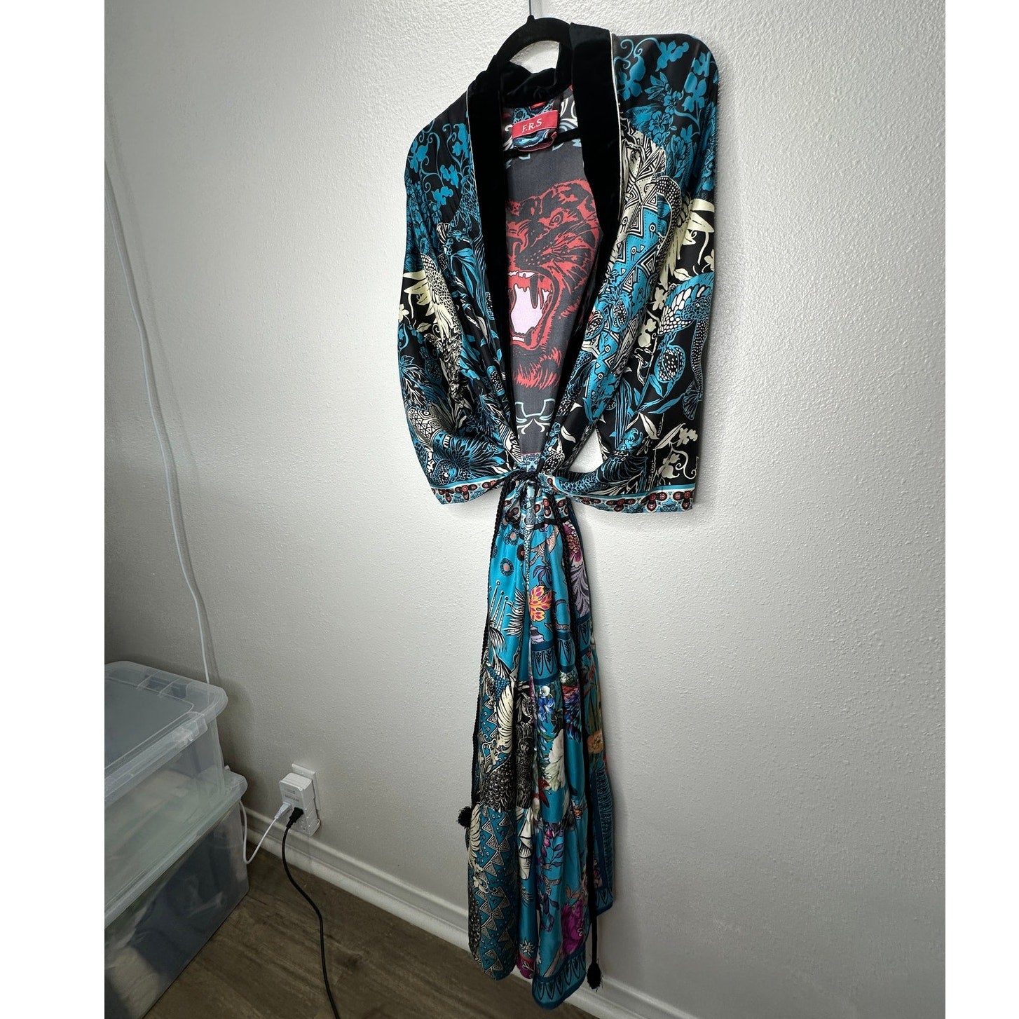 F.R.S. For Restless Sleepers Cream Black Blue Red Multi-Color Bird Floral Tiger Print Black Velour Trim Tie Kimono