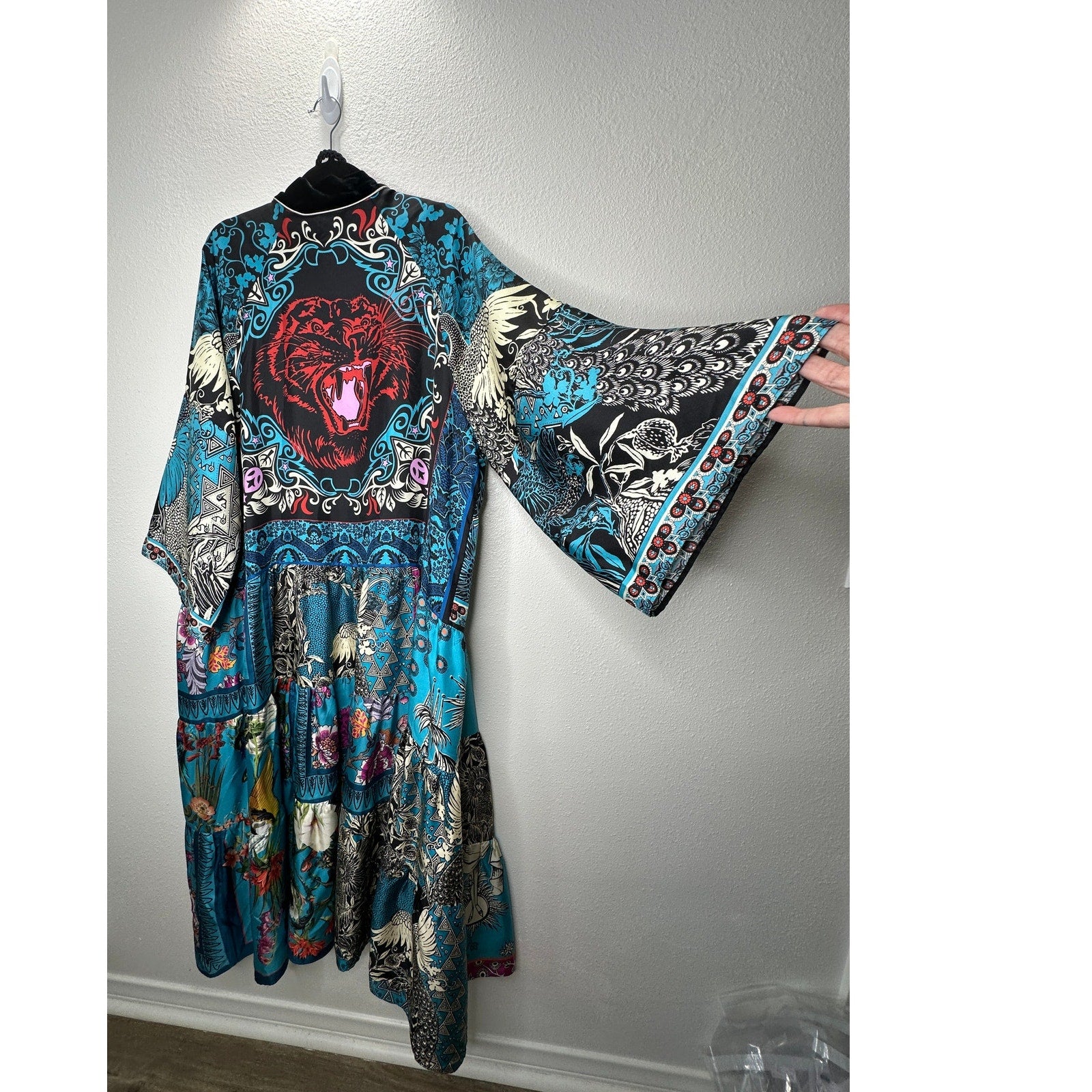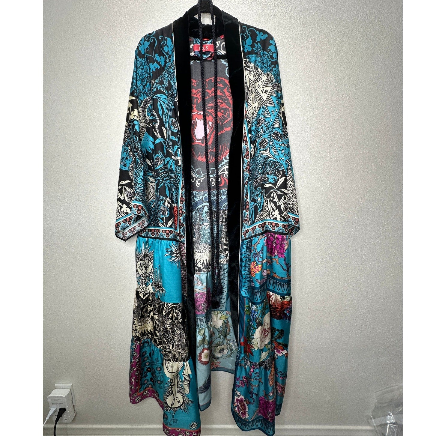 F.R.S. Cream Black Blue Red Multi Bird Floral Tiger Print Kimono M