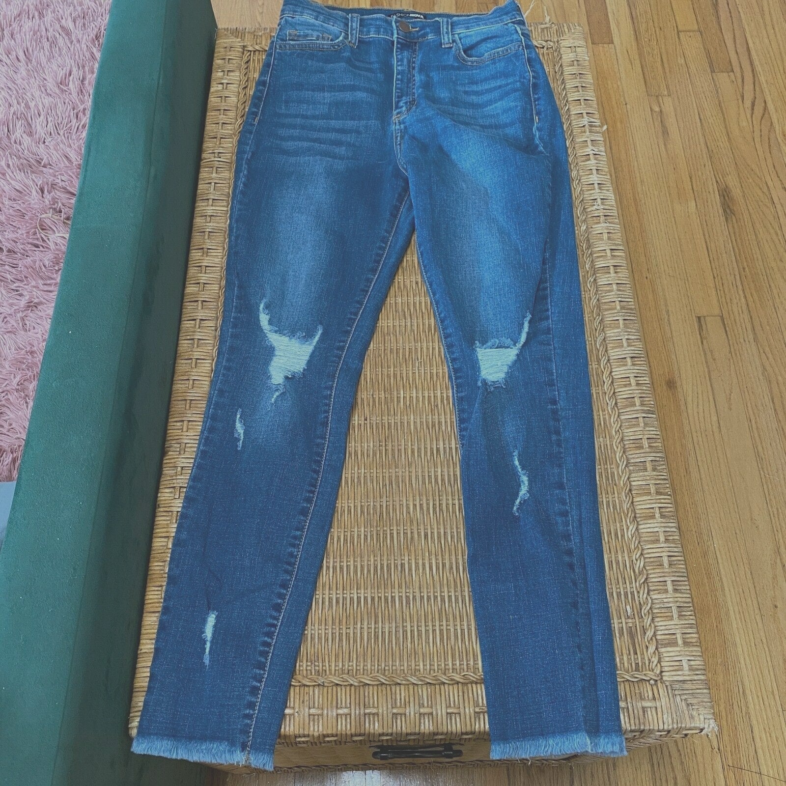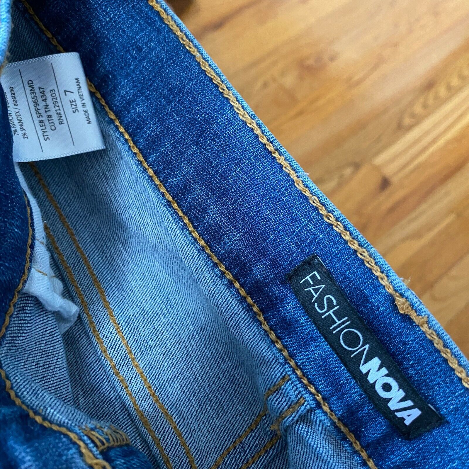 Fashion Nova Smiley High-Rise Distress Knees Jean Medium Blue Wash Raw Hem 7