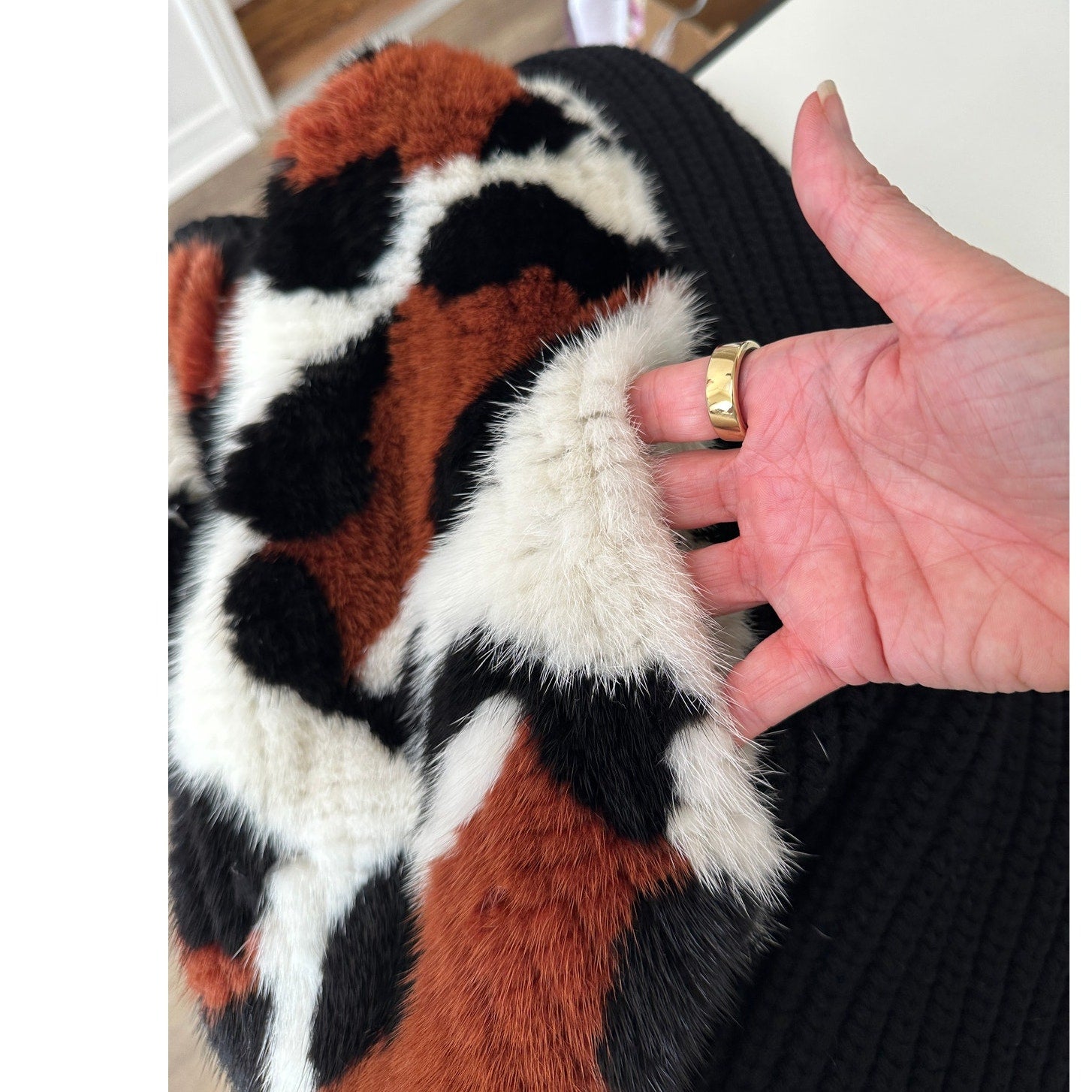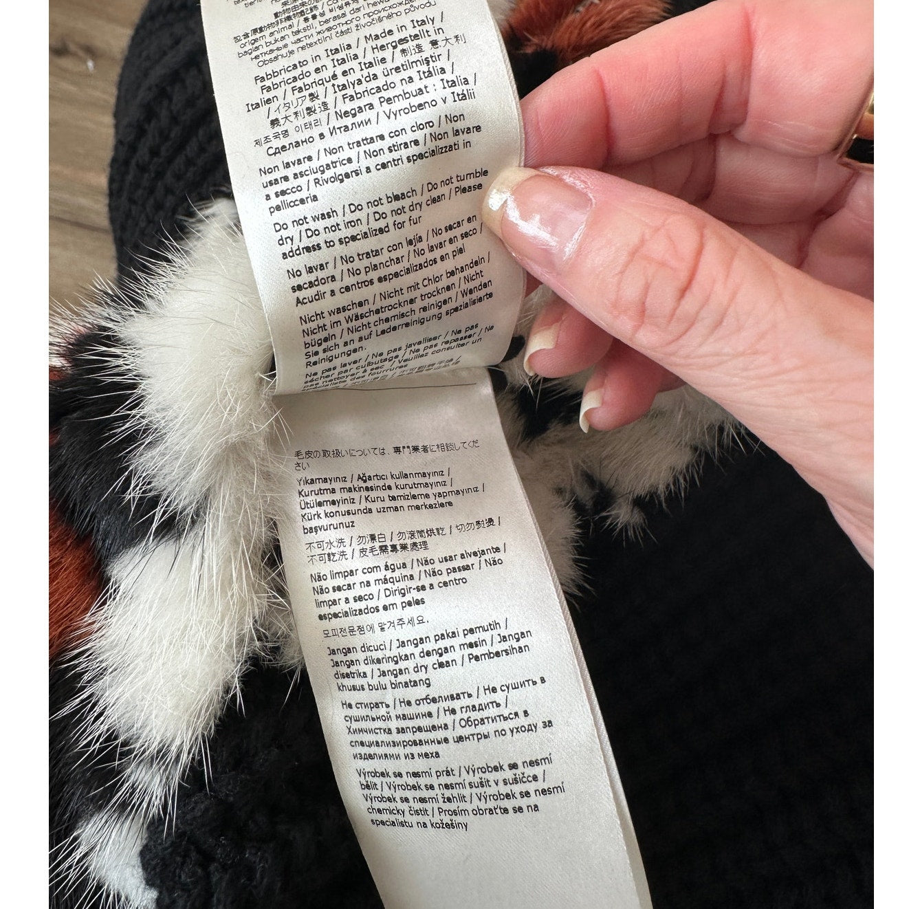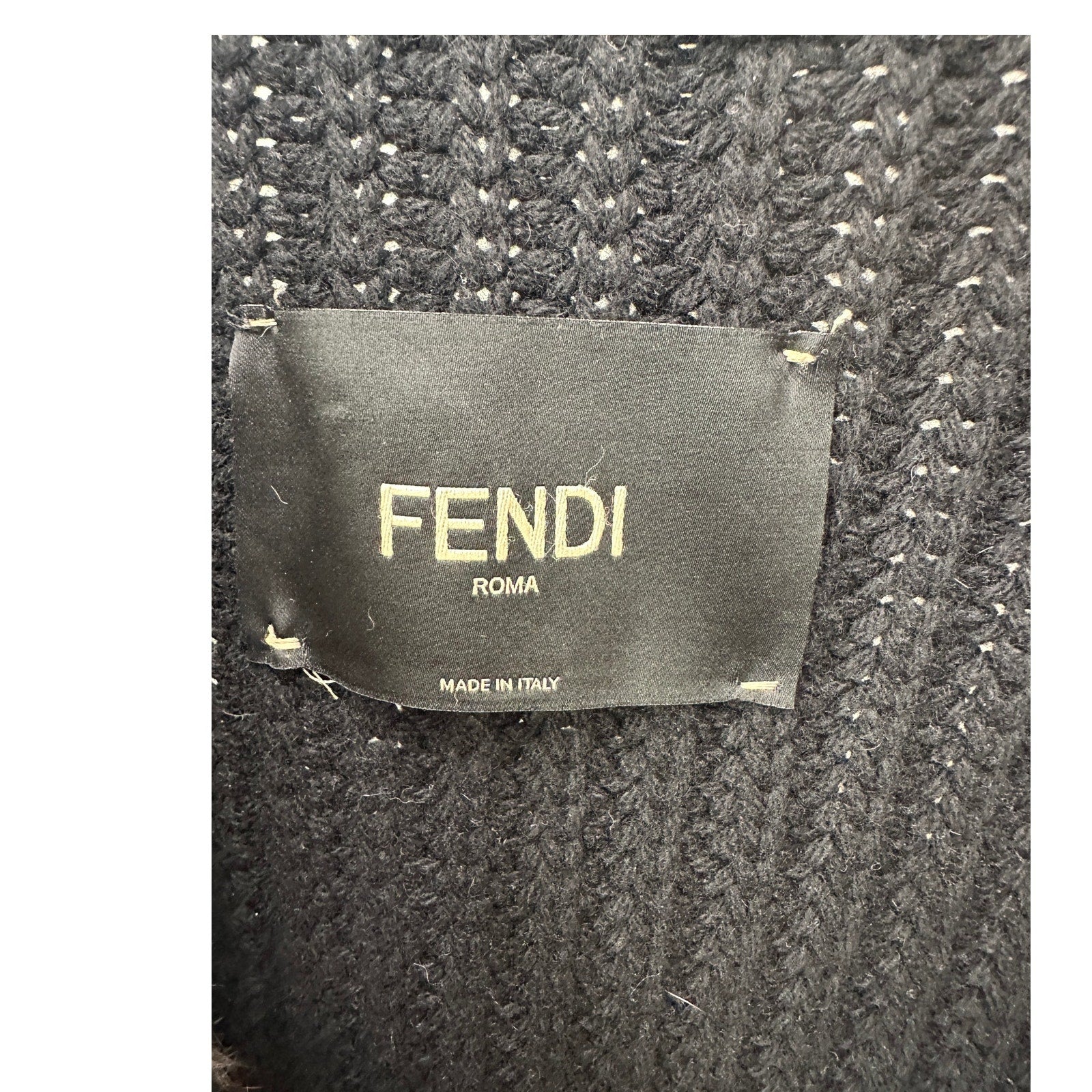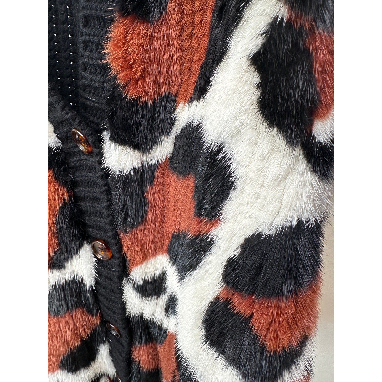 This luxurious Fendi cardigan showcases the brand’s signature mix of opulence and modern design. Crafted in Italy from a soft cashmere and wool knit, it features voluminous balloon sleeves and a plush mink fur front in a striking white, brown, and black animal print pattern. The design includes front button closures and practical side pockets, blending comfort with couture craftsmanship. Perfect as a statement layering piece for cold-weather dressing or elevated casual looks. Good used condition with minimal signs of wear; fur is soft and glossy, knit is clean and intact.