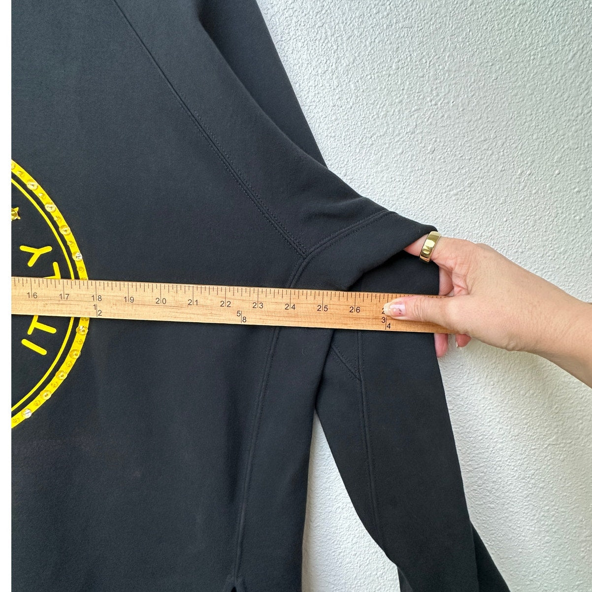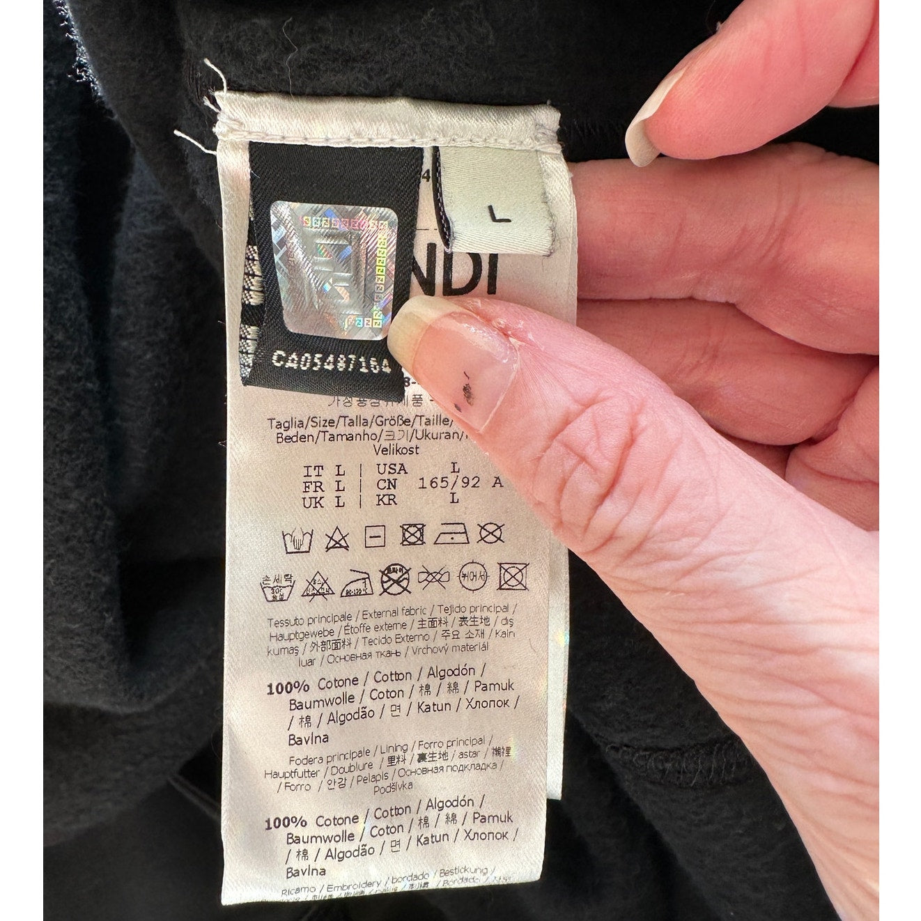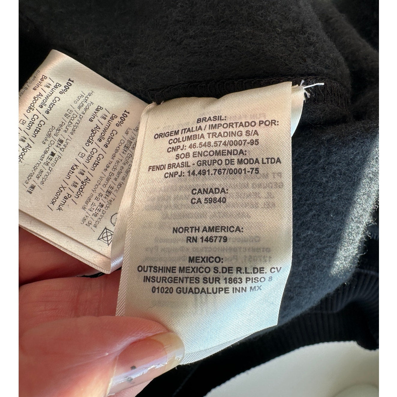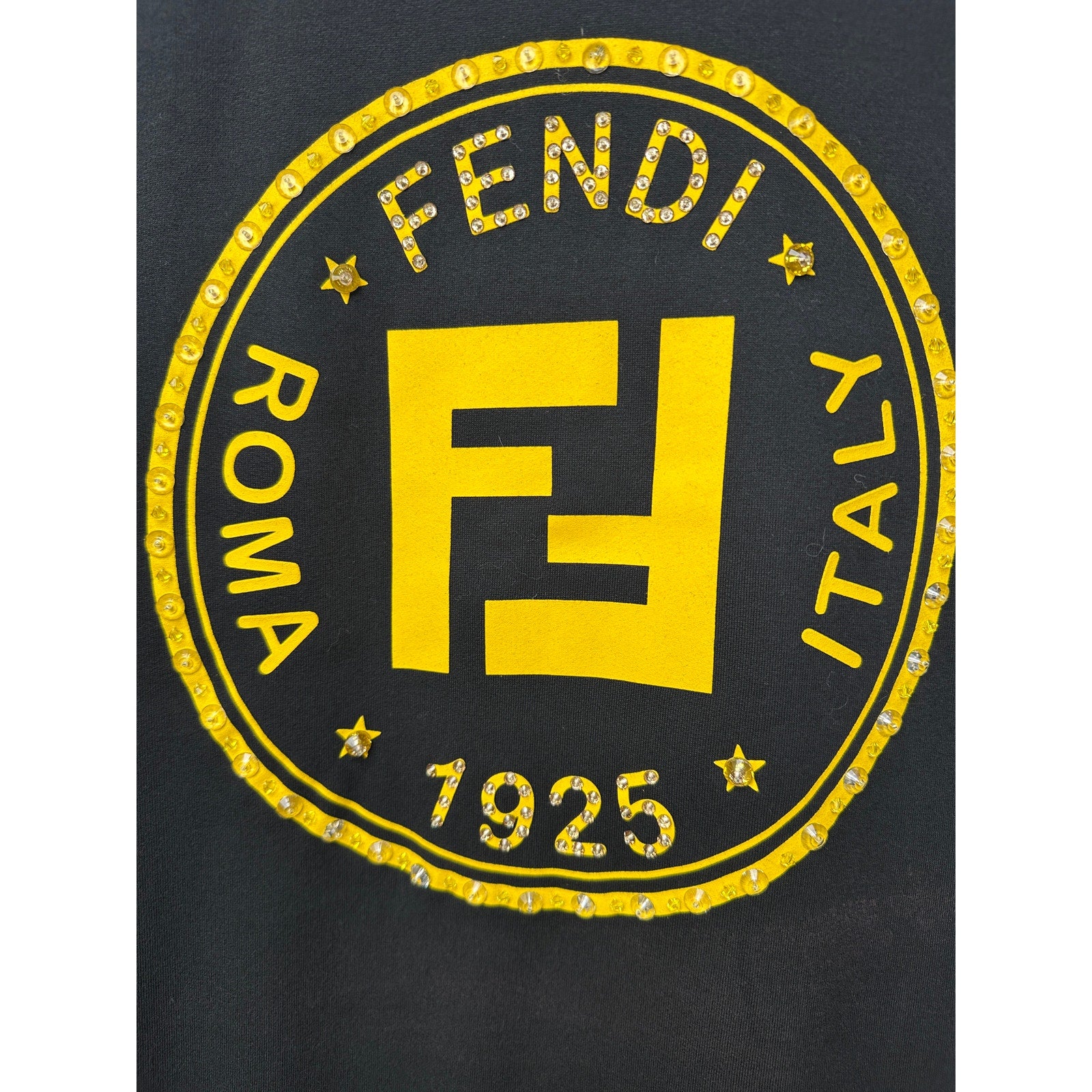 Statement crewneck featuring Fendi’s circular “Roma Italy 1925” logo at front with sequin and rhinestone accents. Soft 100% cotton fleece with raglan sleeves, ribbed collar/cuffs/hem, and pullover silhouette. Made in Italy. Note: light discoloration on front—see photo.