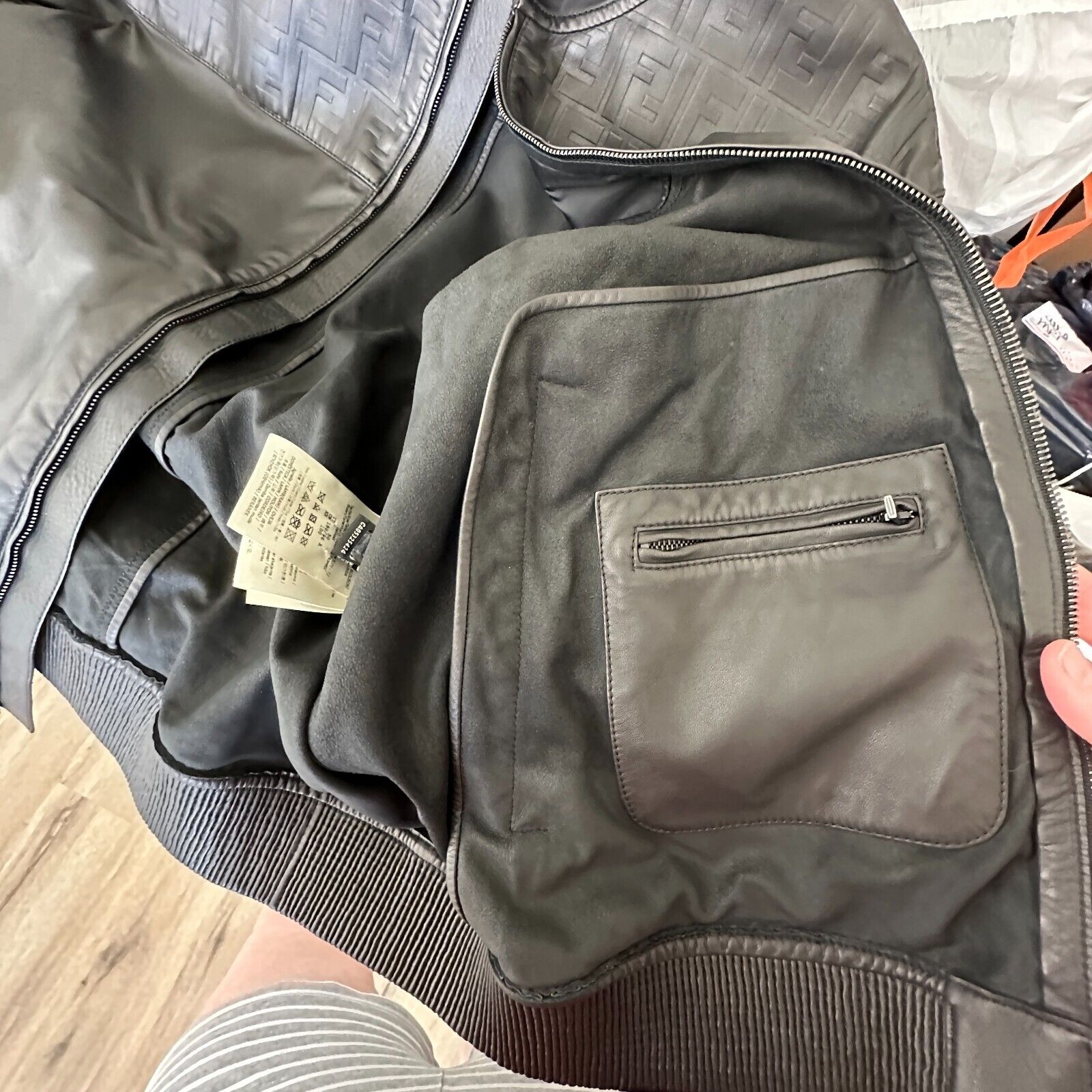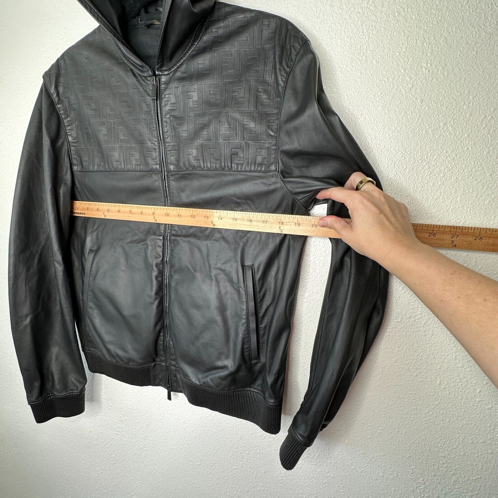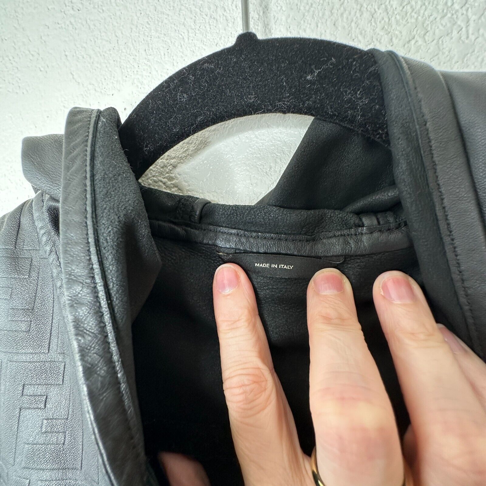 Fendi Black Soft Lambskin Leather Fendi Embossed Monogram Front Long Sleeve Hooded Unlined Jacket