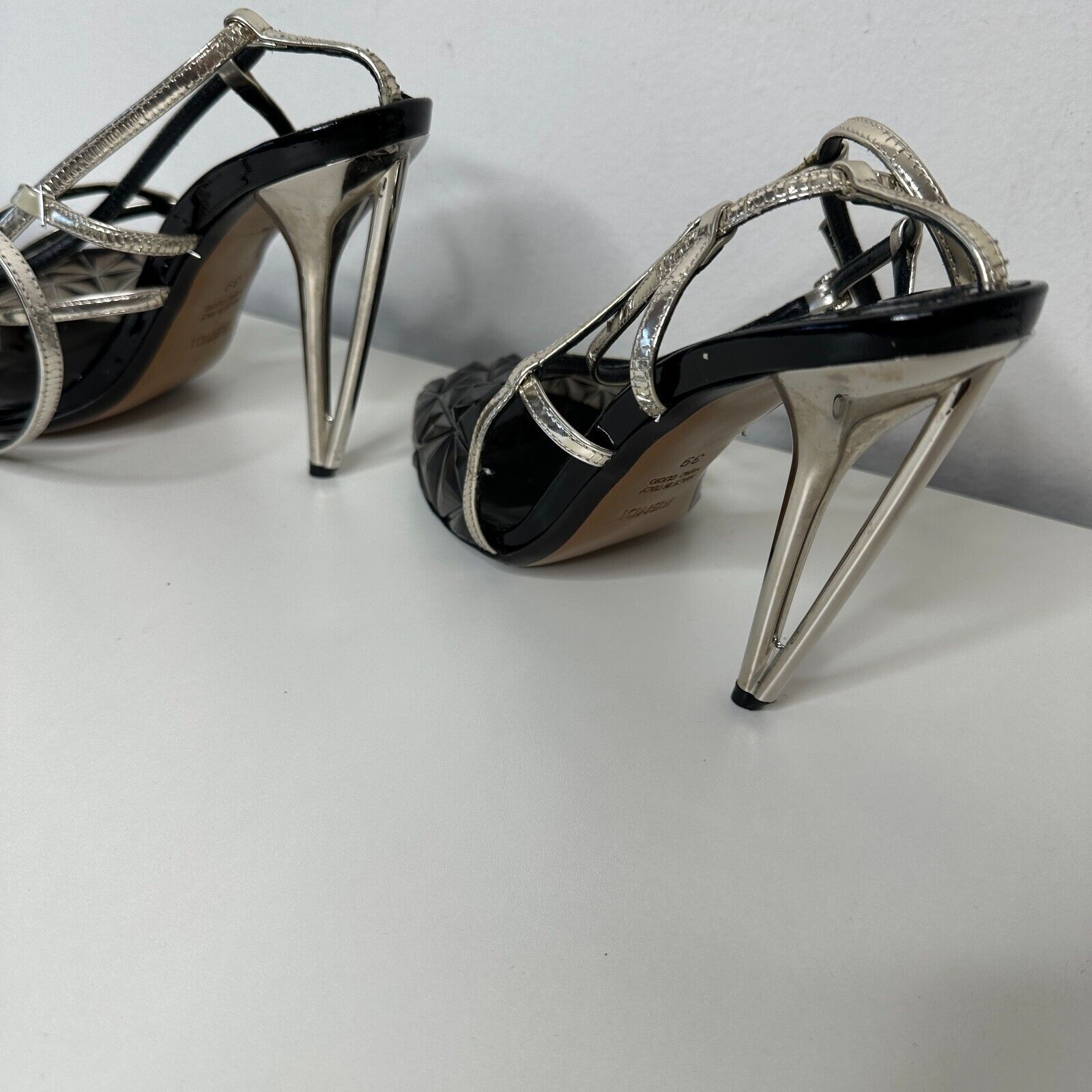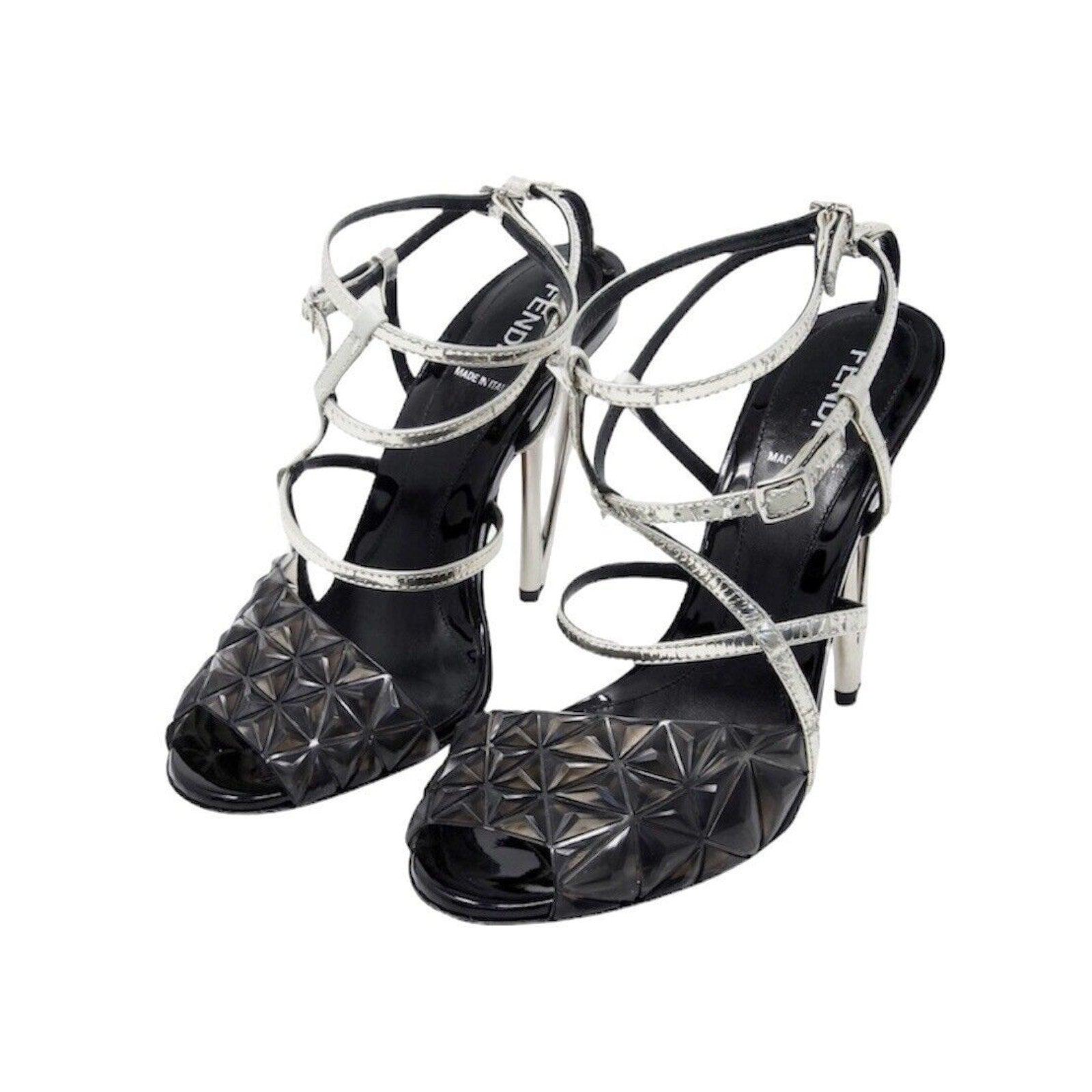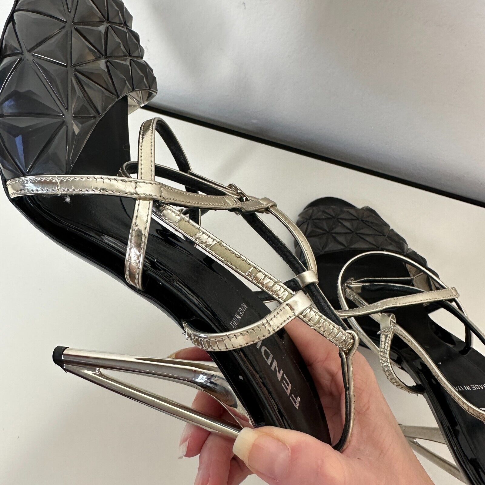 Fendi Black & Silver Iridia PVC Gray Buckle Pyramid Disco Metallic Silver Strap Sandals Heels Black Gray & Silver
