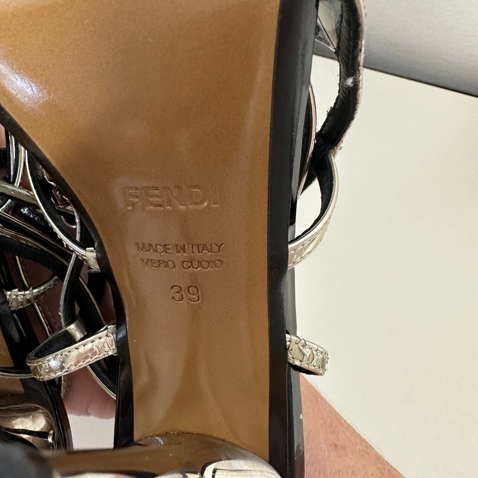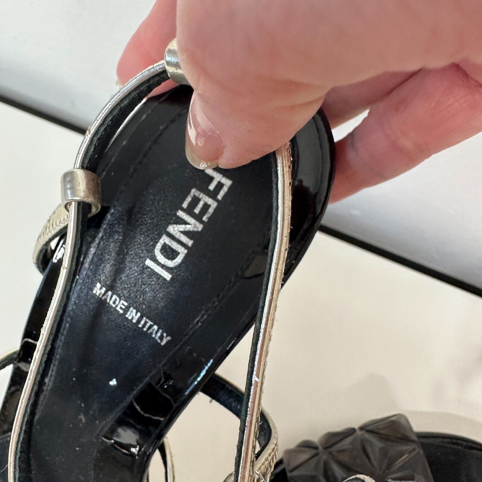 Fendi Cute Black Silver Iridia PVC Buckle Pyramid Metallic Strap Sandals 39