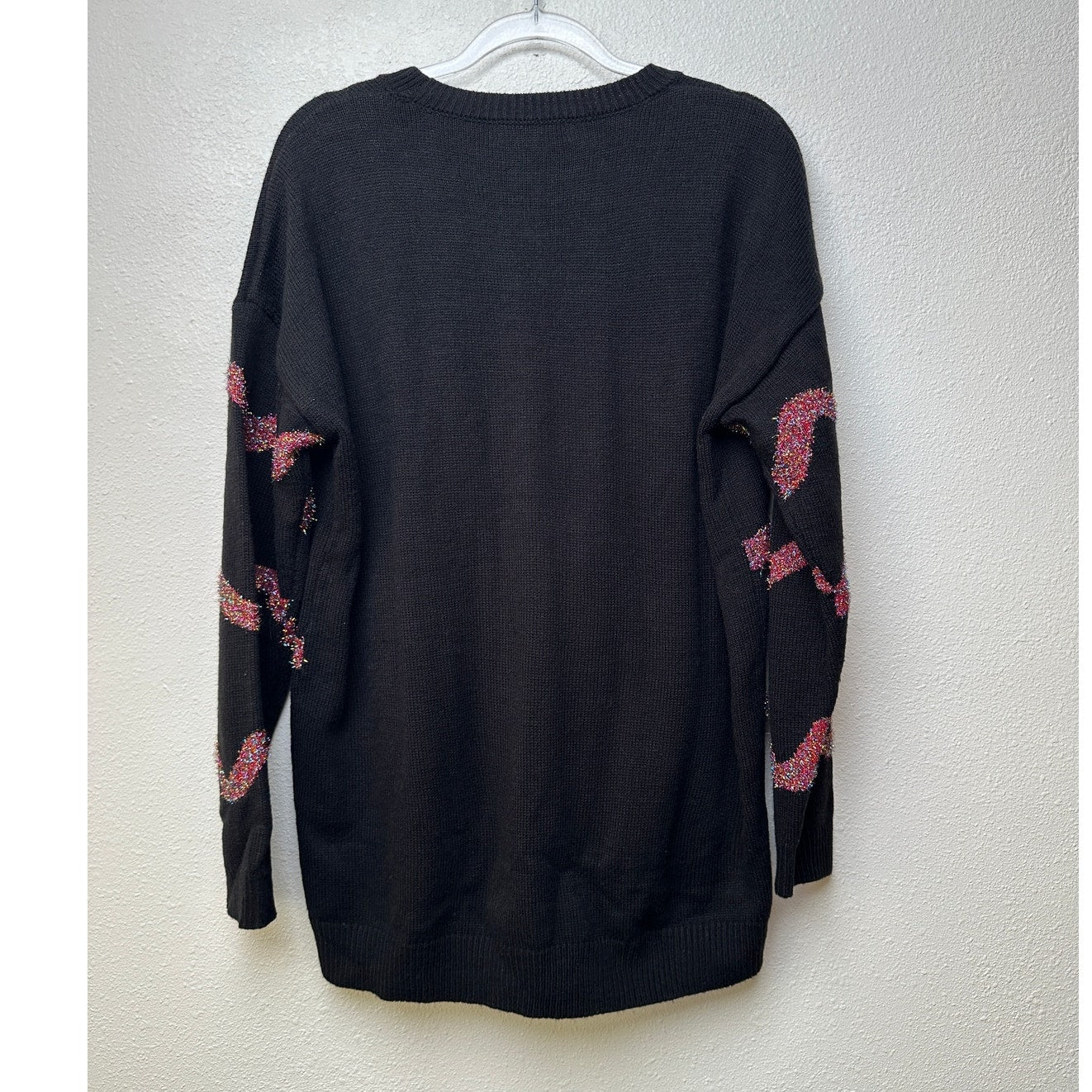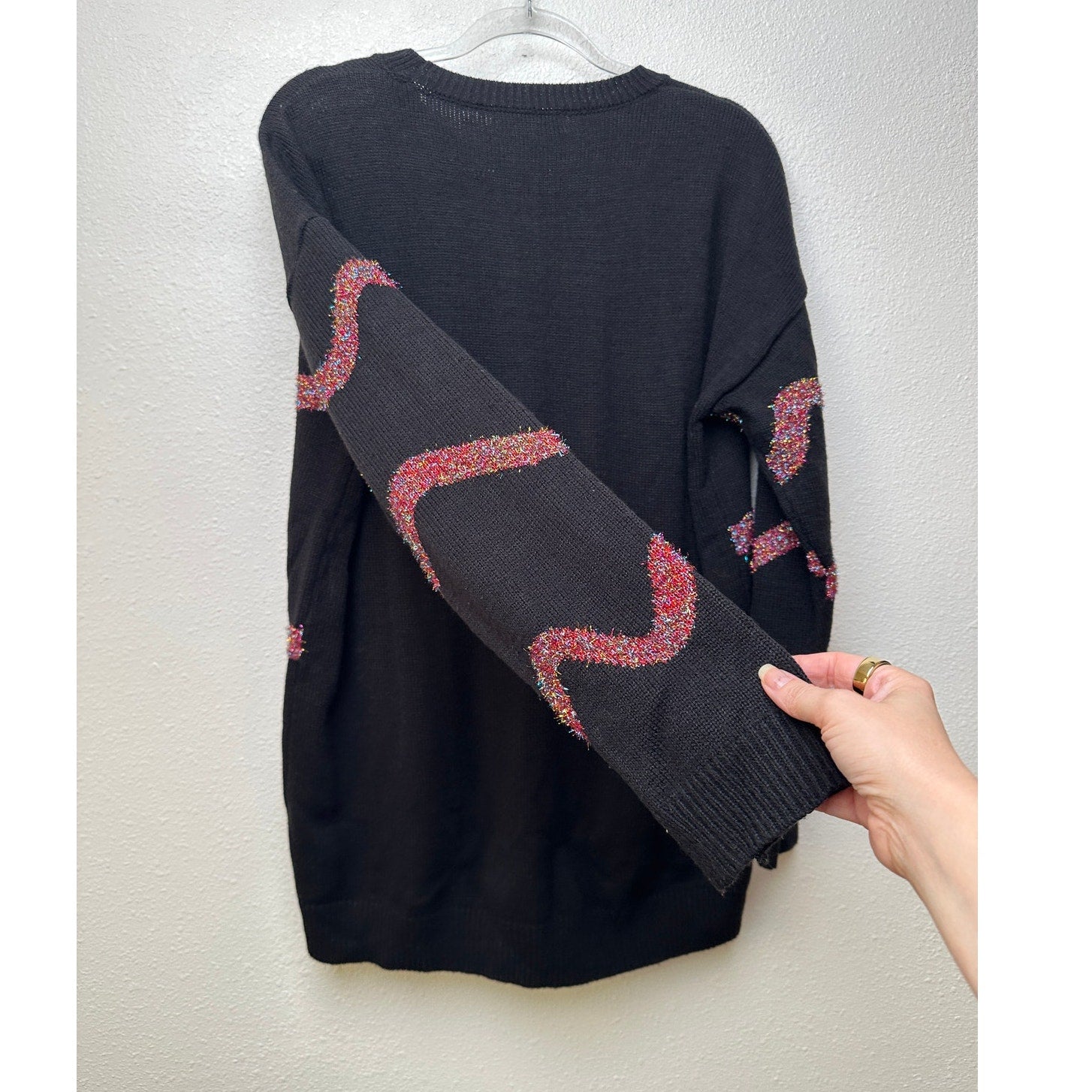Festive longline pullover knit with sequin and embroidered holiday appliqués (tree, gingerbread, candy cane, stocking, stars) and metallic tinsel-effect garland stripes. Crew neckline, long sleeves, ribbed cuffs/hem, and an easy tunic silhouette that works as a sweater dress or layered over leggings for parties and holiday photos.