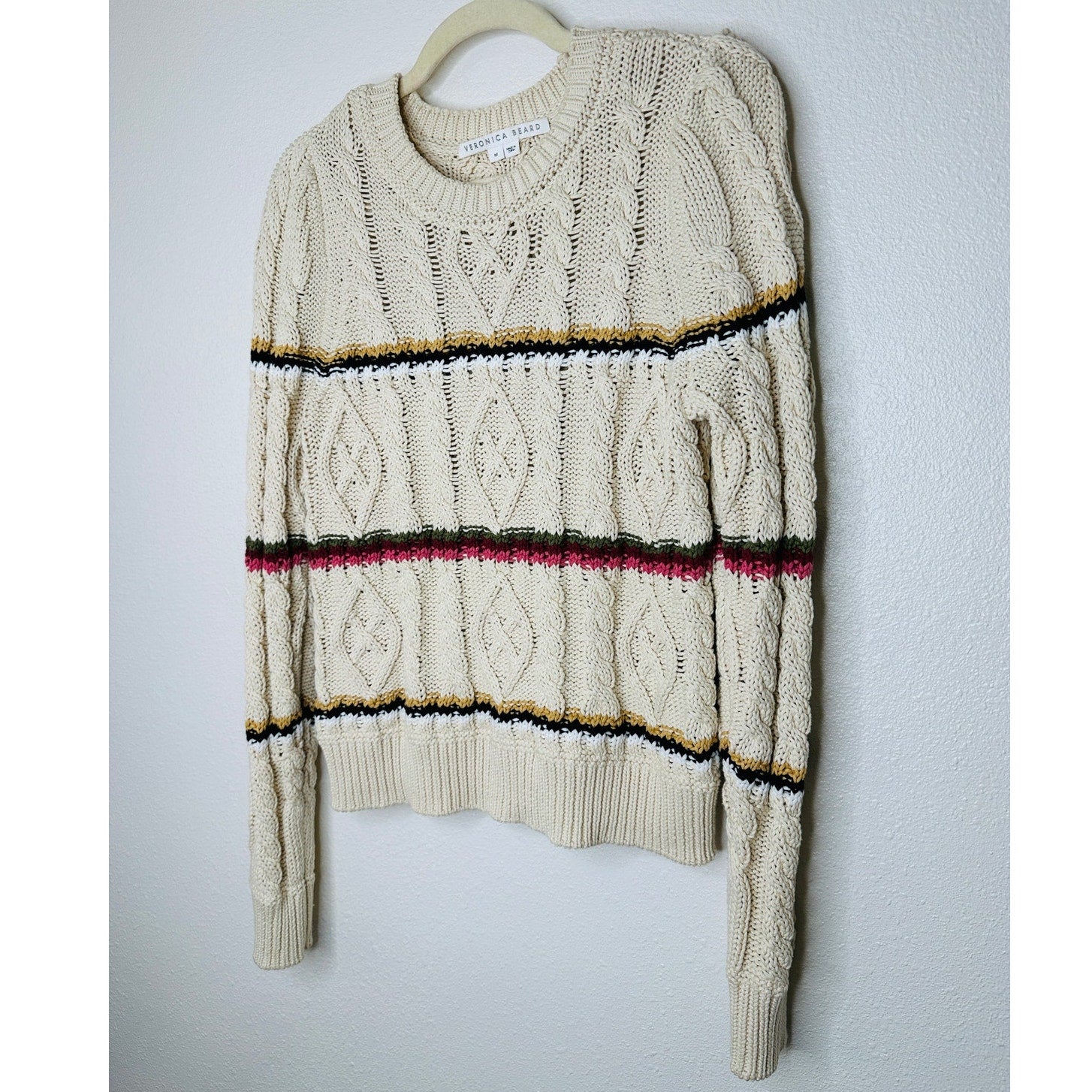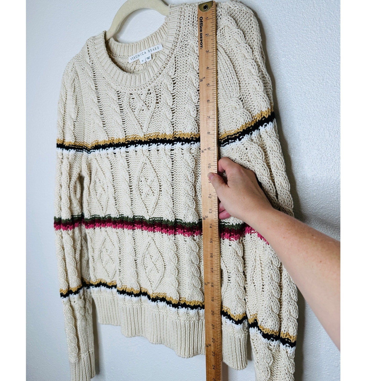 Veronica Beard Bruna Cream Tan Black Multicolor Striped Chunky Knit Pullover Long Sleeve Sweater