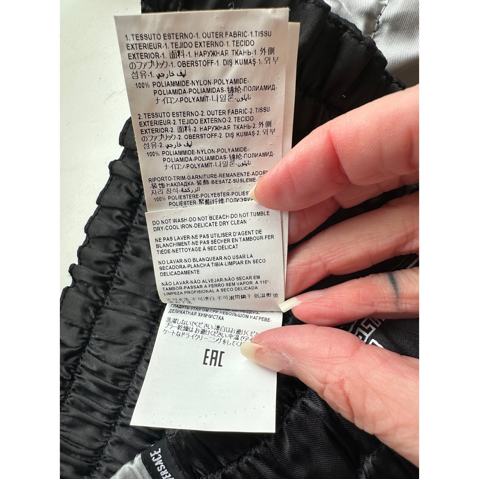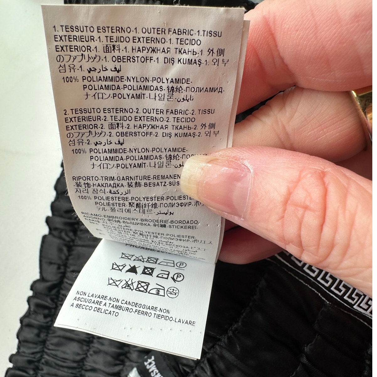 Make a fierce fashion statement in these rare designer Muay Thai-style boxing shorts by Versace. Featuring a high-shine metallic black front and silver satin sides, these shorts are elevated with oversized black sequin appliqués — including a glittery “Versace” logo and signature Medusa head patches on each leg. Complete with a smocked elastic waistband and branded side taping