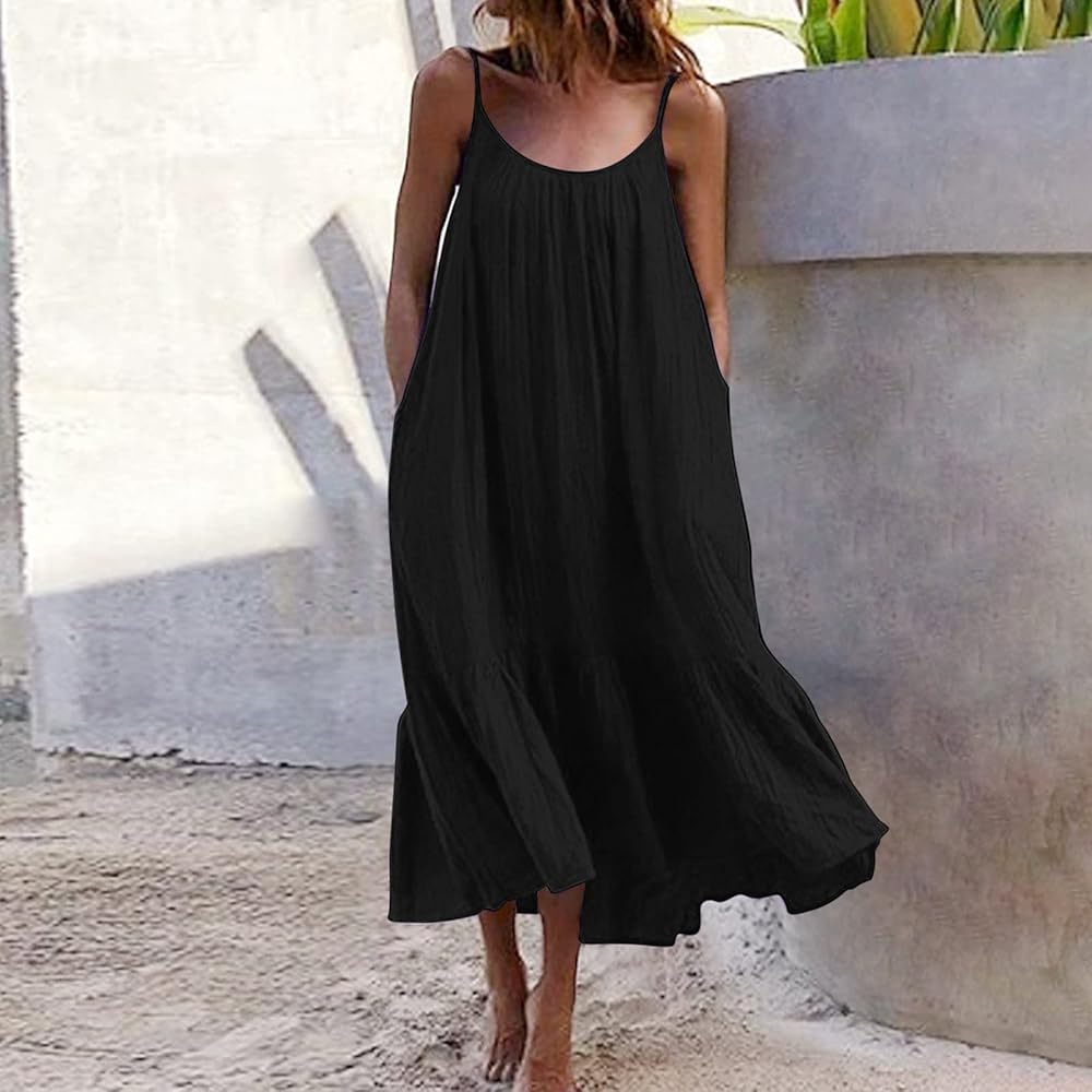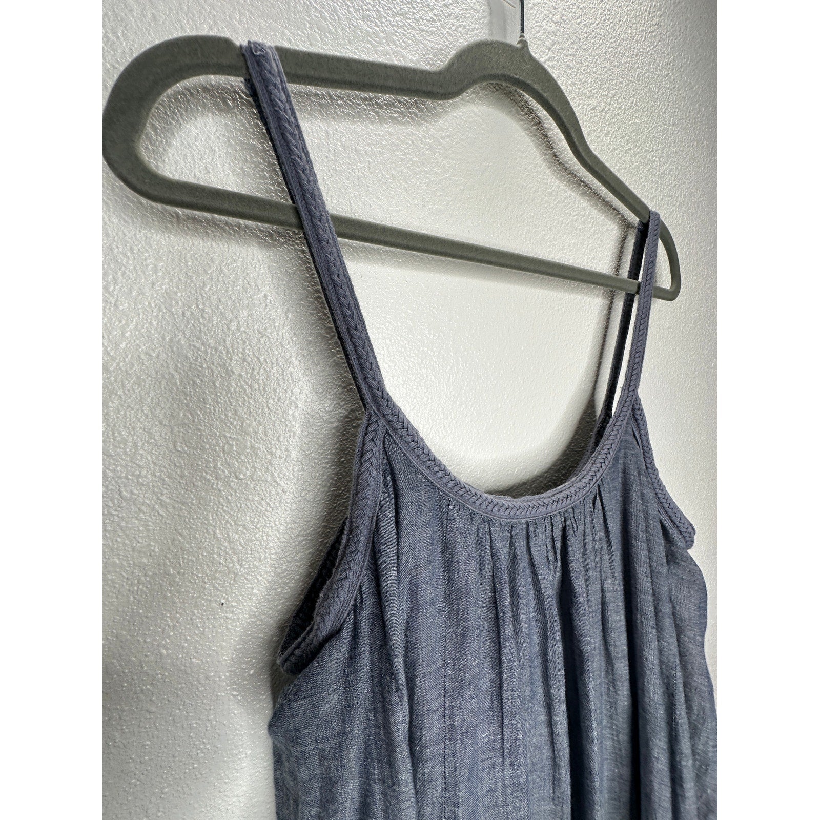 Vetiver Blue Gray Denim Round Braided Neckline & Strap Flowy Ruffle Sleeveless Summer Dress