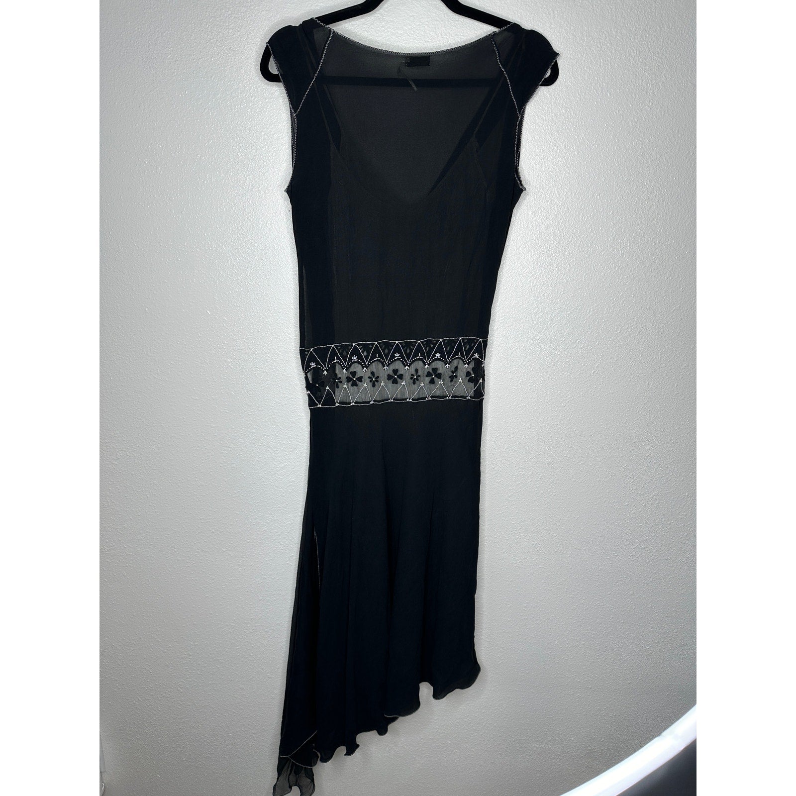 VINTAGE Max Studio Special Edition Whisper Sheer 100% Silk Dress Delicate Embroidery & Beaded at Waist Matching Cream Silk Slip Asymmetrical Hem