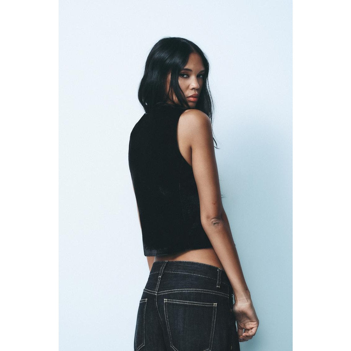 Zara Black Velour Tailored Button Front V-Neck Vest Front Flap Details Matching interior lining
