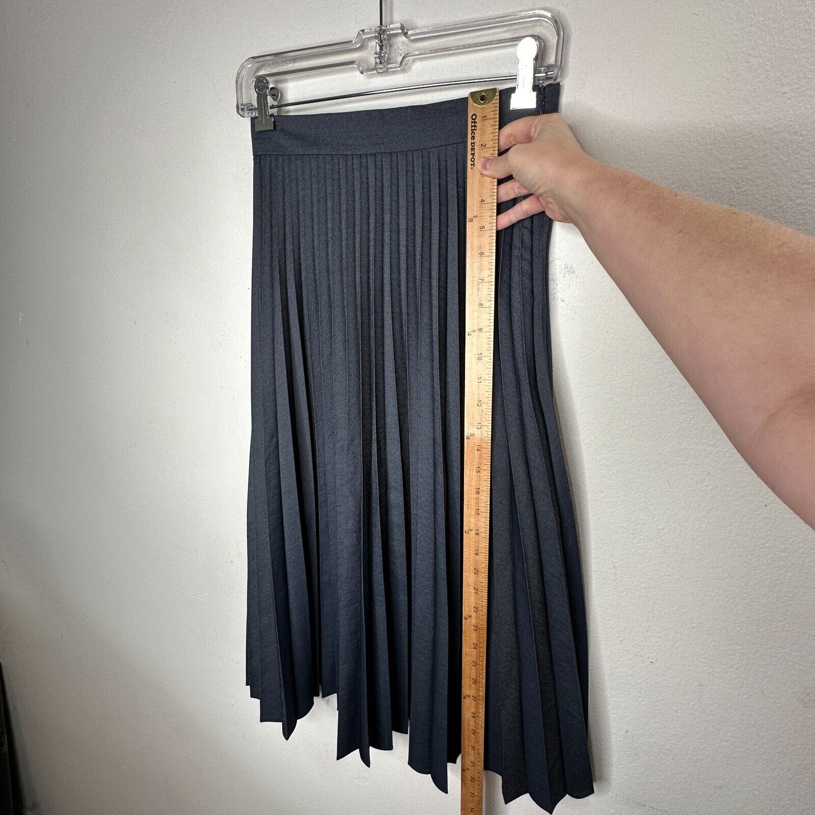 this skirt offers the perfect combination of comfort and fashion. The box pleats create a flattering silhouette, while the dark blue wash adds a touch of elegance. The waistband ensures a secure fit, and the side zip makes it easy to put on and take off. Whether you're heading to work or going out for a night on the town, the Zara midi skirt is sure to turn heads.