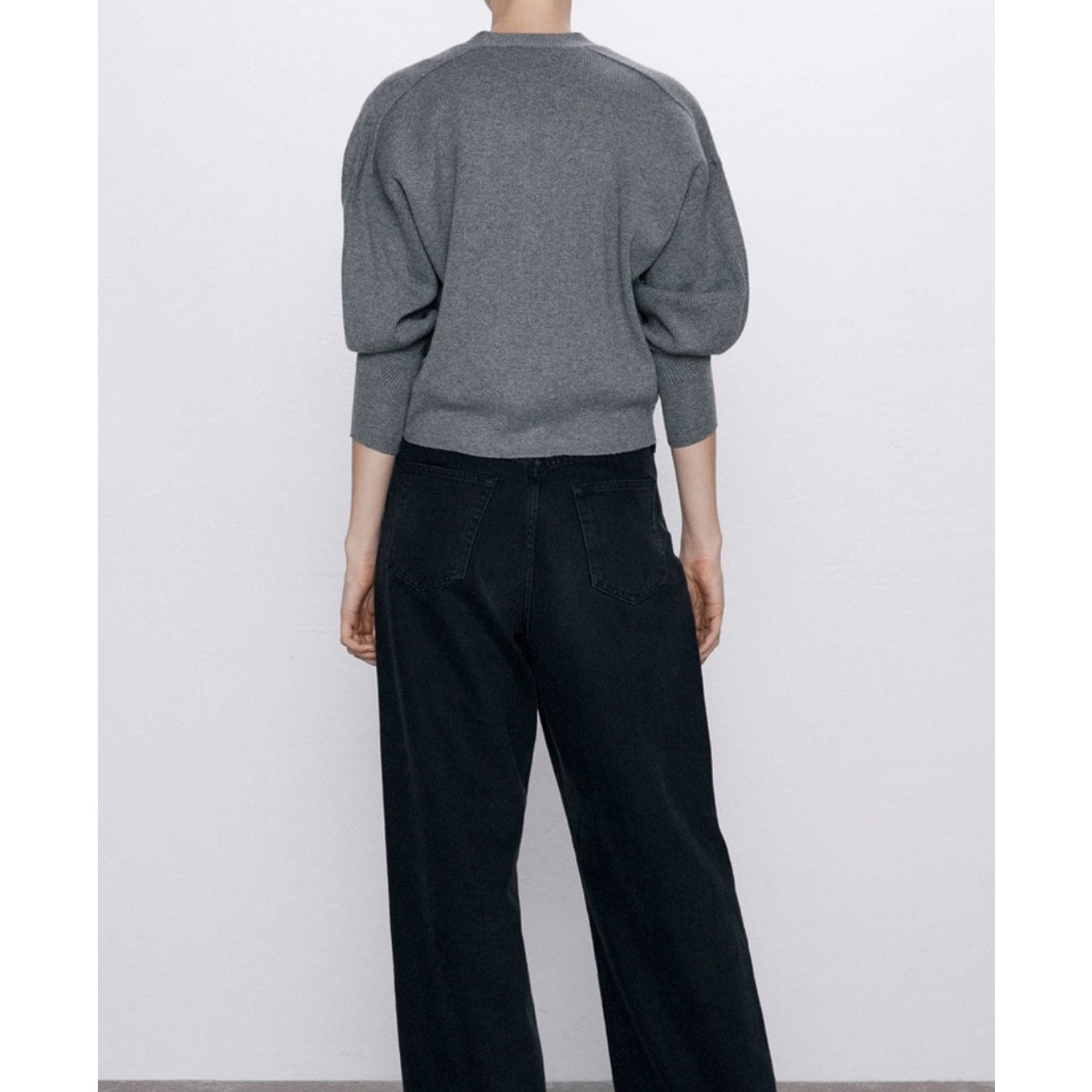 Zara Heather Gray Micro Rib V-Neck Front Button Long Sleeve Crop Cardigan Sweater
