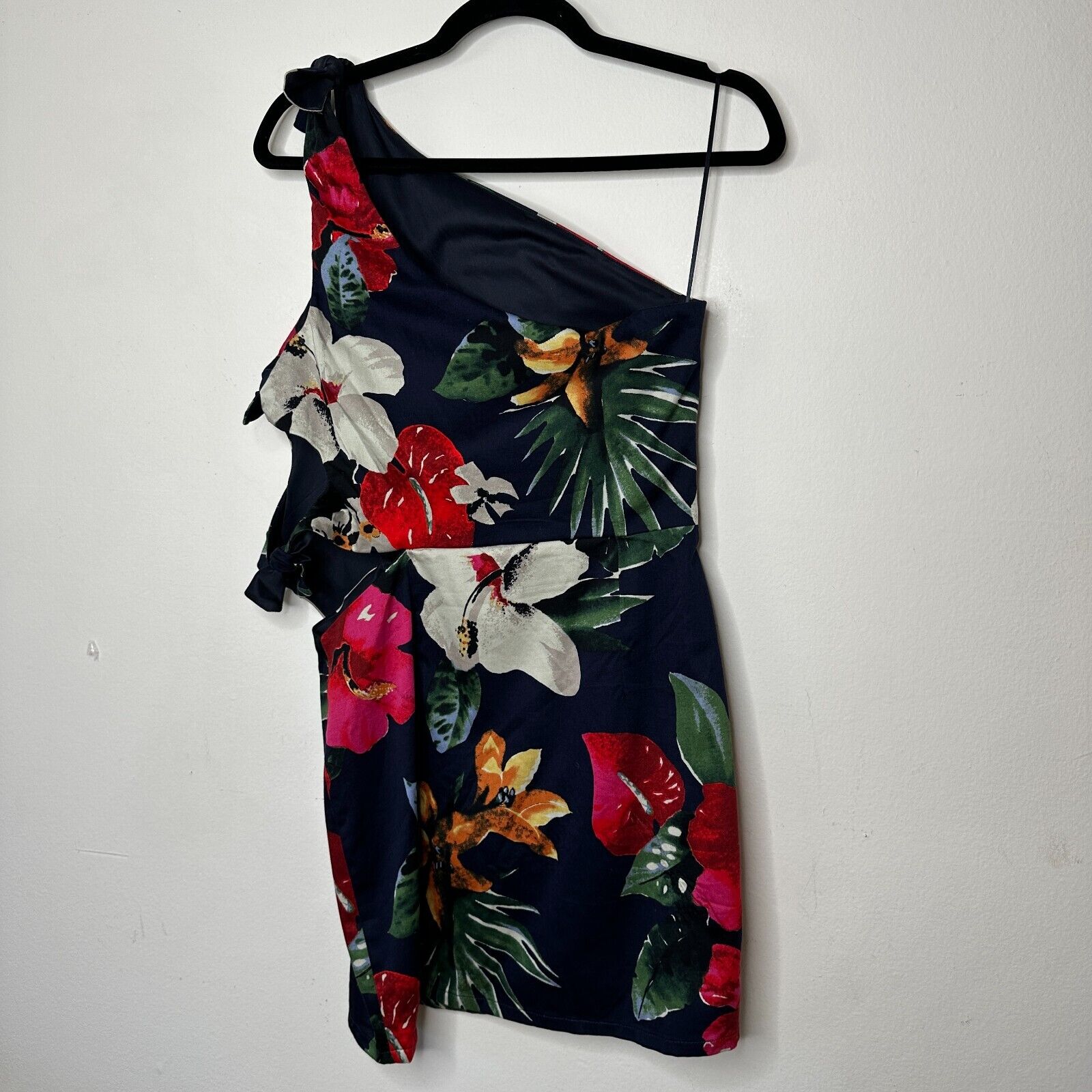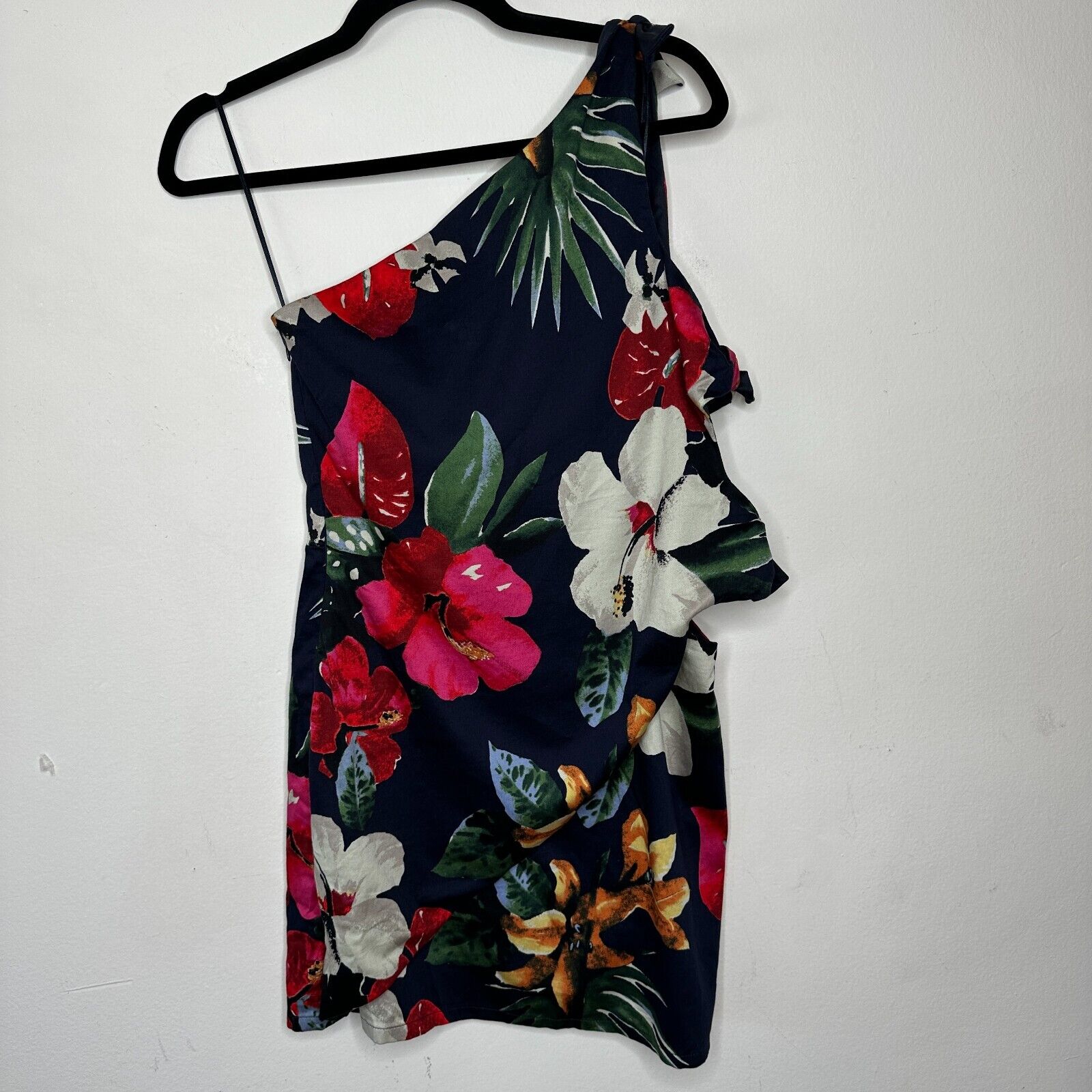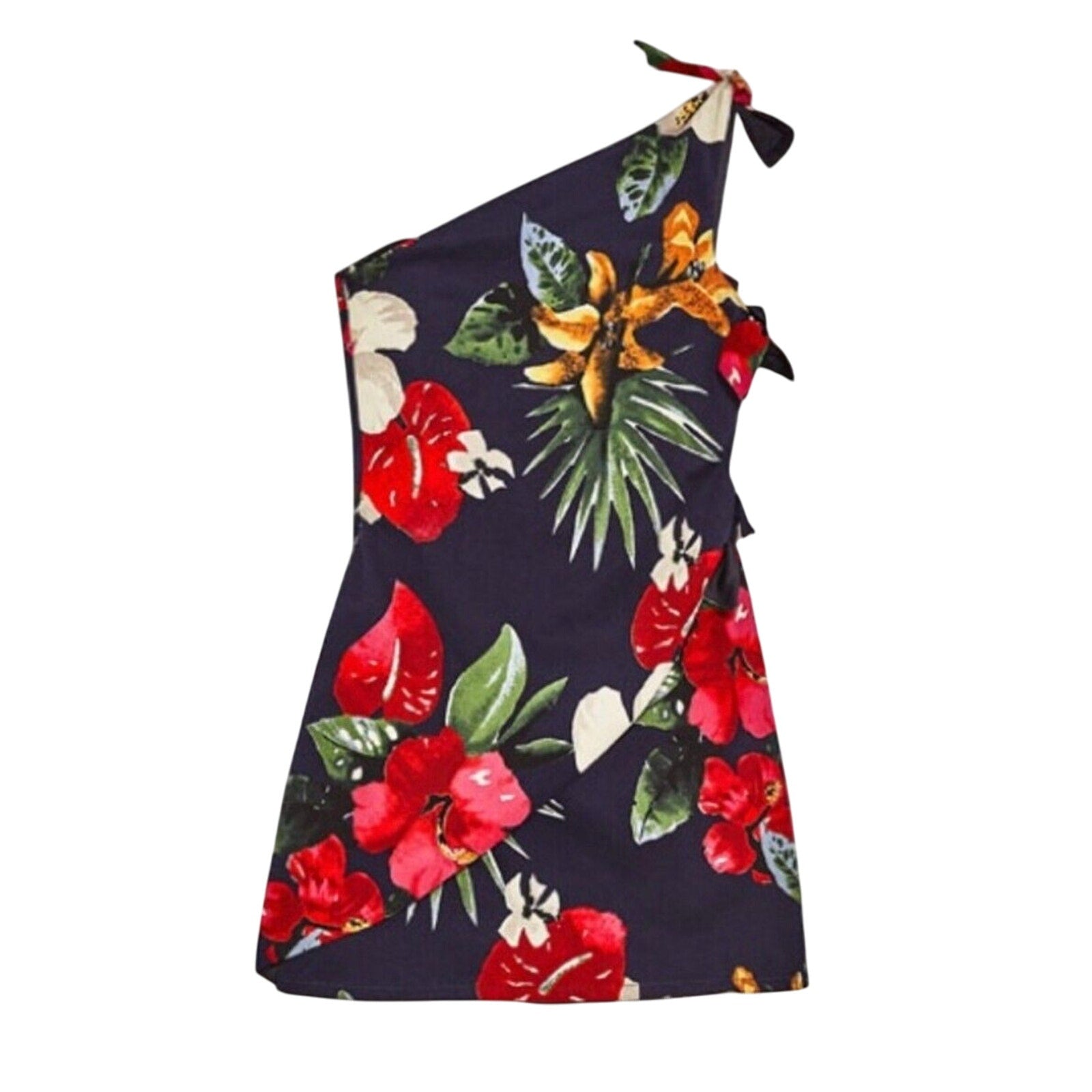 Zara Navy Red White Floral 3 Side Tie One Shoulder Mini Dress Side Zip Medium