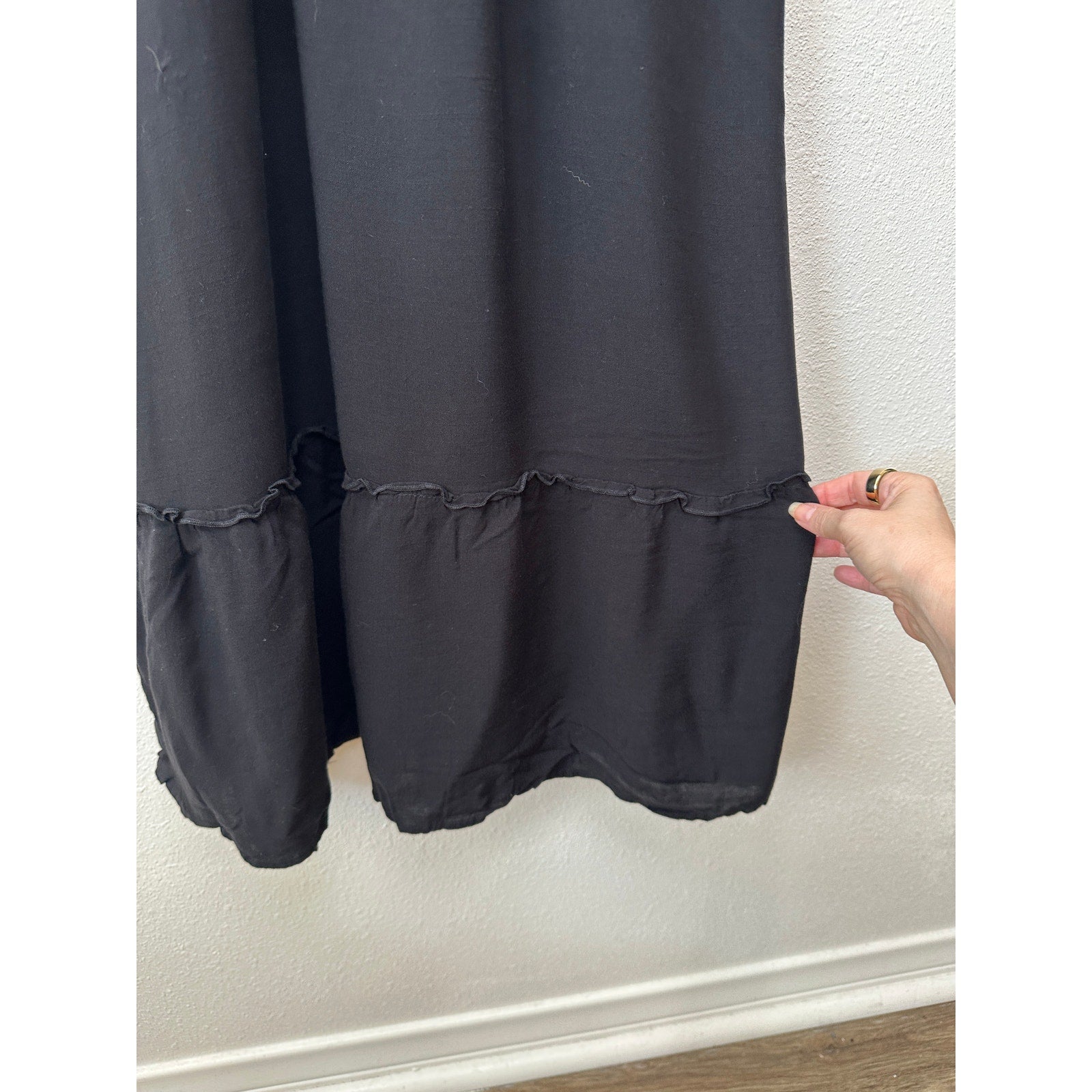 Sleeveless maxi with stretch smocked bodice and square neckline for a flexible fit. Adjustable tie shoulder straps and a flowy A-line skirt with soft ruffle hem. Pull-on styling; lightweight drape. Material: 100% viscose. Care per tag: machine wash 30°C or hand wash, do not bleach, steam iron. Easy for warm-weather wear, travel, brunch, or casual events.